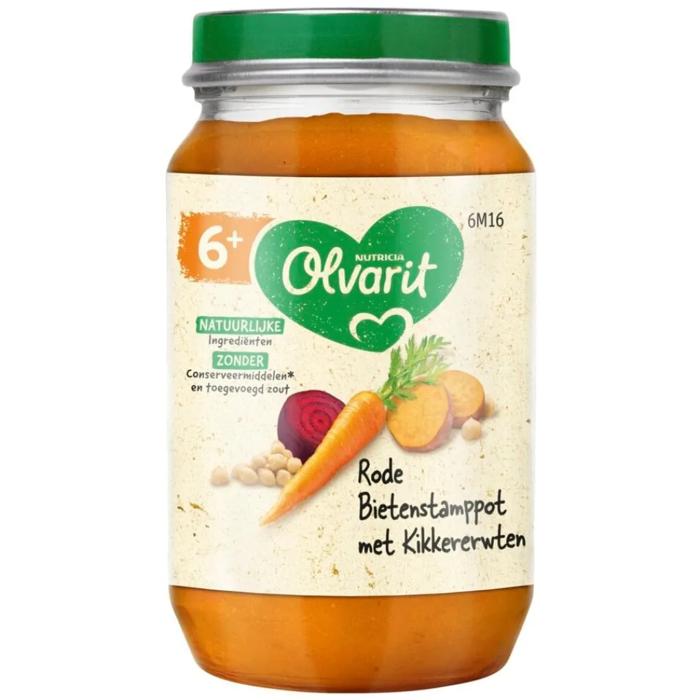 Nutricia Olvarit 6M+ Rode Bietenstamppot met Kikkererwten is een babyhapje met pure en natuurlijke ingrediënten voor je baby vanaf 8 maanden.