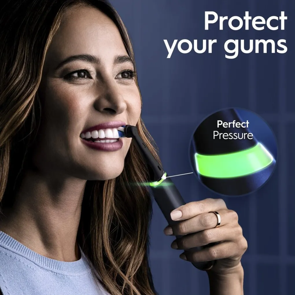 • Bescherm je tandvlees met iO poetsdruksensor van Oral-B, de enige die aangeeft of je te hard, te zacht of precies goed poetst voor een effectieve en veilige reiniging