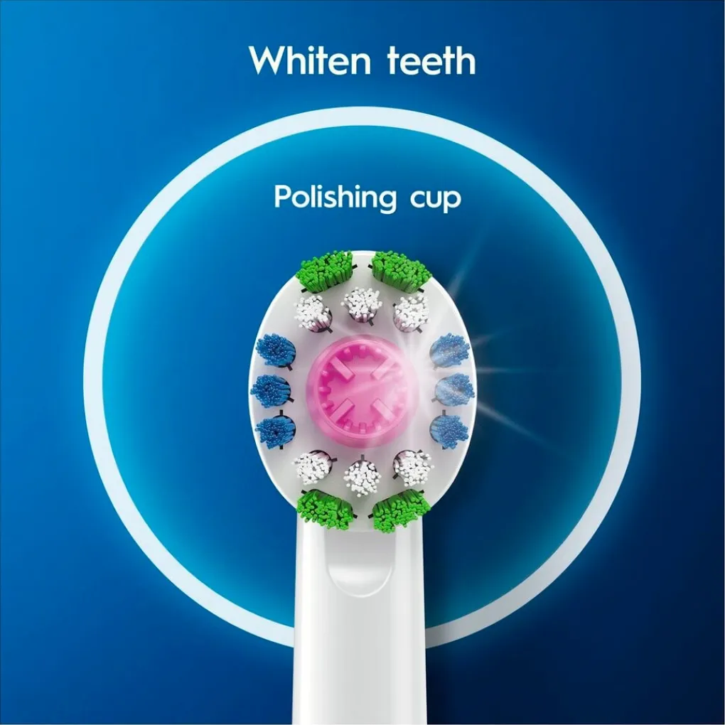 • De Oral-B 3D White heeft een unieke polijstkop om verkleuringen op het tandoppervlak te verwijderen.