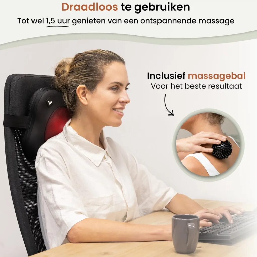 Dankzij het draadloze ontwerp van het massagekussen kun je genieten van een ontspannende massage zonder beperkt te worden door snoeren. Dit maakt het eenvoudig om het kussen te gebruiken waar je maar wilt, thuis, op kantoor, of zelfs onderweg. Een volledig opgeladen massagekussen is tot wel 90 minuten draadloos te gebruiken. Daarnaast is de achterkant van het apparaat voorzien van een anti-slip laag. Hierdoor blijft het massage apparaat altijd op zijn plek, wel zo handig!