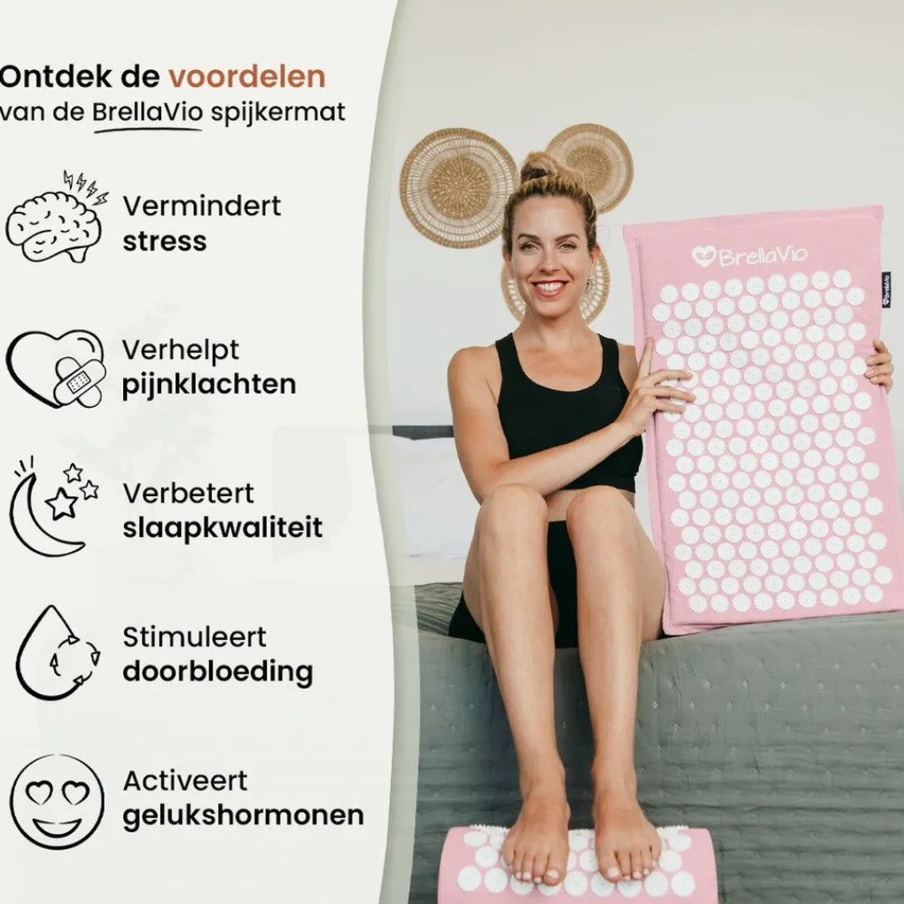 Ervaar jij stress, pijnklachten, of slaap je slecht? Maak dan kennis met jouw persoonlijke masseur: de BrellaVio spijkermat. De duizenden drukpunten op de spijkermat zorgen voor een prikkel in het lichaam die de bloedsomloop stimuleert, blokkades op energiebanen vrijmaakt en gelukshormonen activeert. Hierdoor kom je tot volledige ontspanning, ervaar je minder pijnklachten en verbeter je de slaapkwaliteit.