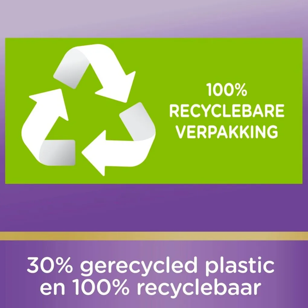 De verpakking is 100% recyclebaar en gemaakt van 30% gerecycled plastic.