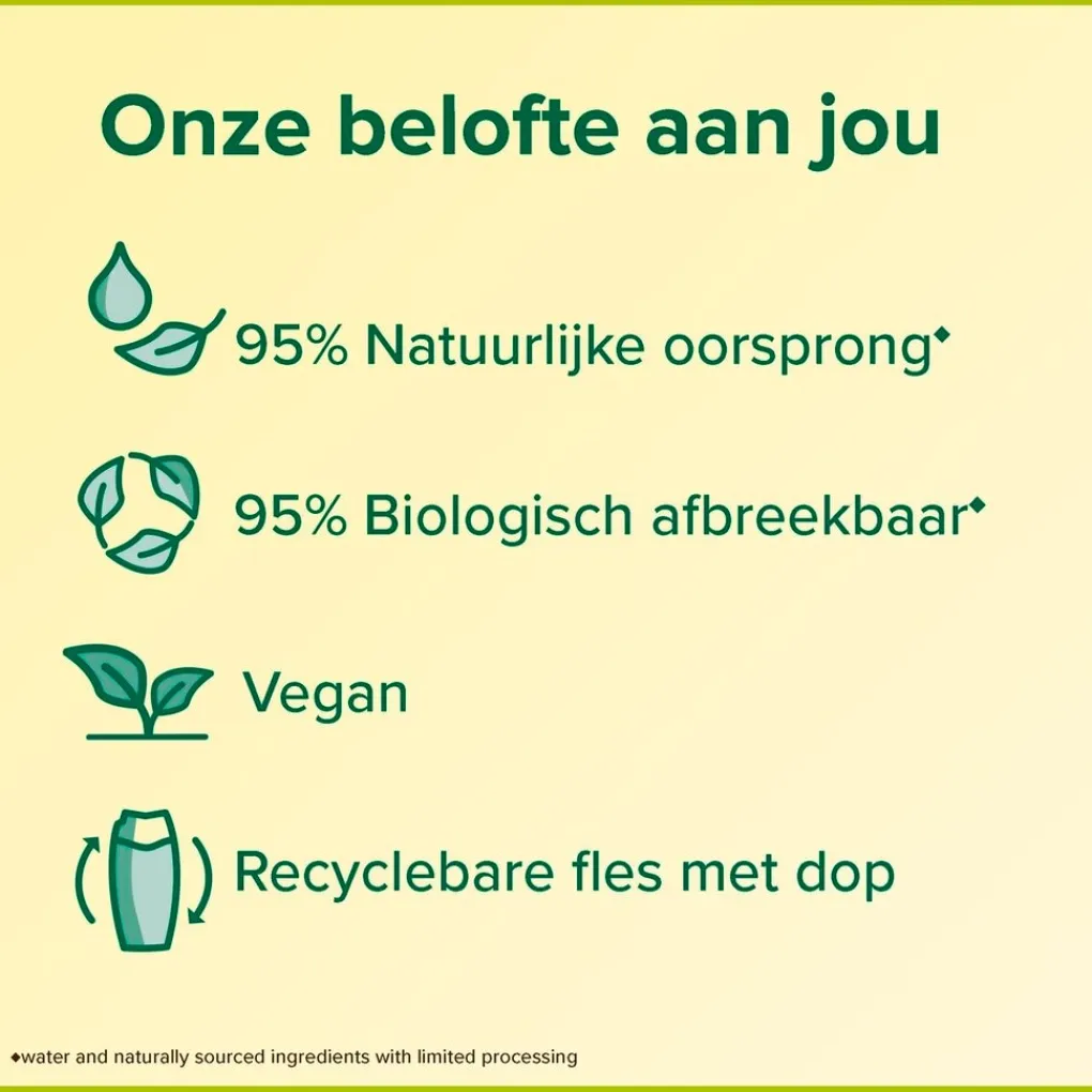 Deze showergel is vegan, is gemaakt met ingrediënten van 95% natuurlijke oorsprong* en heeft een formule die voor 95% biologisch afbreekbaar is. De fles bestaat voor 30% uit gerecycled plastic en is volledig recyclebaar.