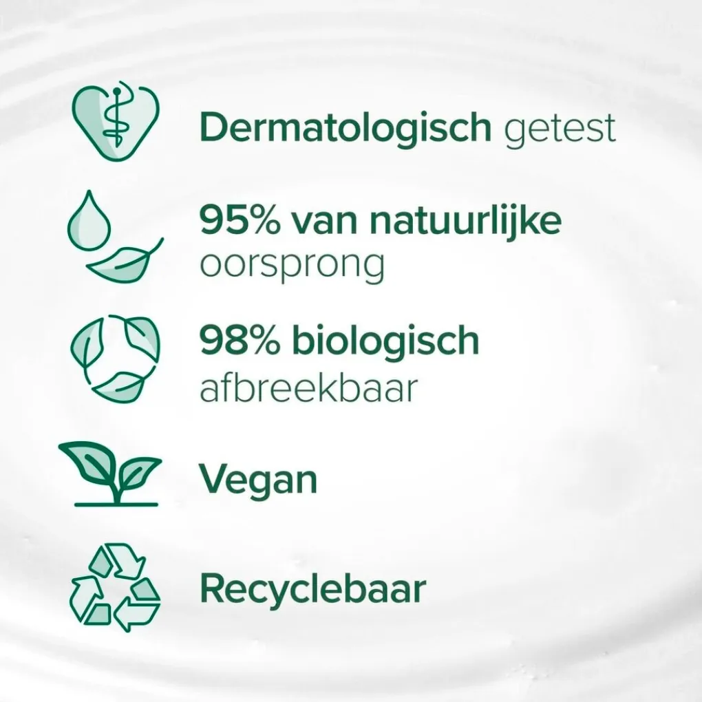 De douchecrème bevat niet alleen plantaardige melk, maar is ook gemaakt met ingrediënten van 95% natuurlijke oorsprong*. De bodywash heeft een voor 98% biologisch afbreekbare formule en zit in een recyclebare fles. De vegan douchecrème is ook dermatologisch getest.