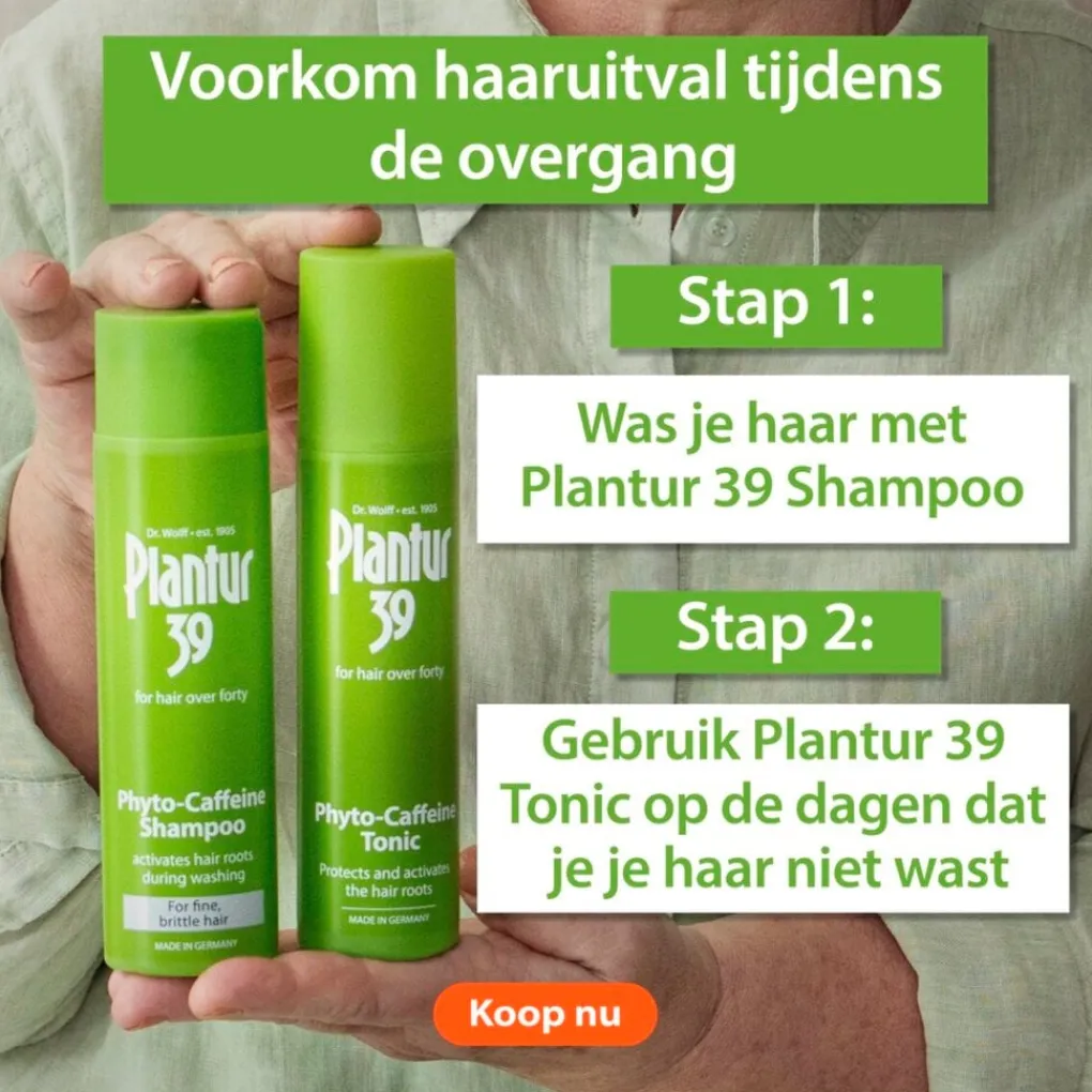 Tijdens de overgang kan je hormoonhuishouding verstoord raken. Hierdoor wordt je haargroei belemmerd. Plantur 39 Tonic met Fyto-Cafeïne beschermt je haarwortels.