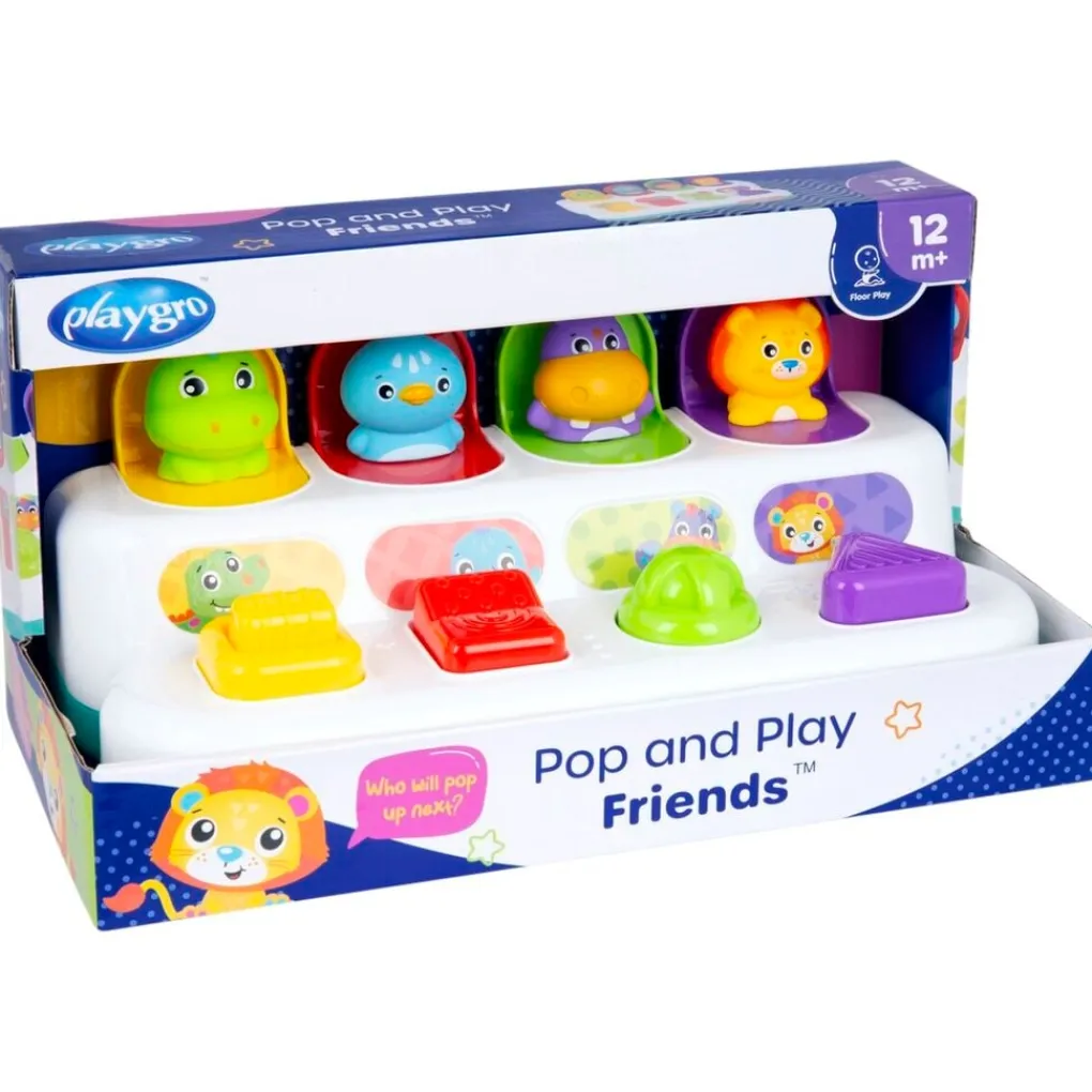 Maak je klaar voor eindeloze verrassingen met de Playgro Pop and Play Friends! Dit leuke speelgoed bevat vier schattige figuurtjes die tevoorschijn komen wanneer je drukt, draait, klapt of schuift.