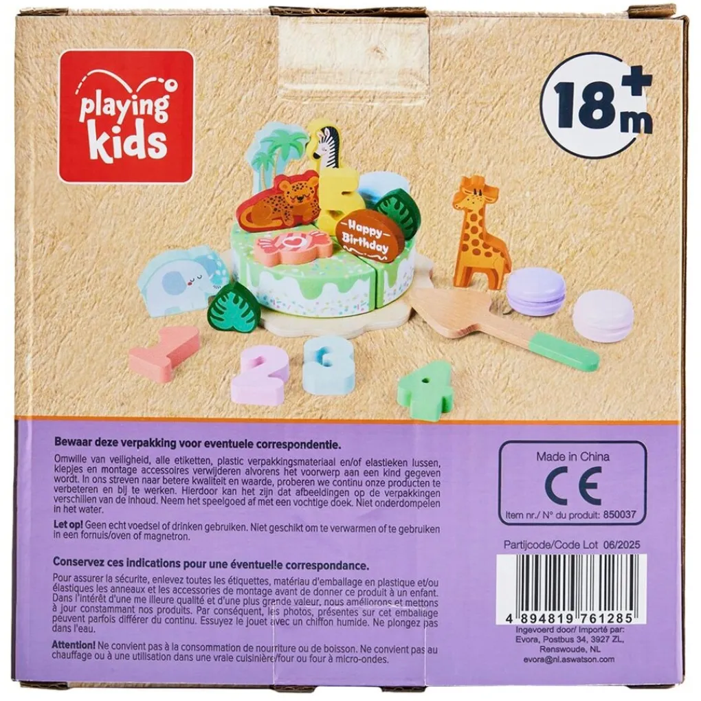 Maak je eigen houten taart en versier hem met de Playing Kids Jungle Verjaardagstaart. De 22-delige set is geschikt vanaf 18 maanden.