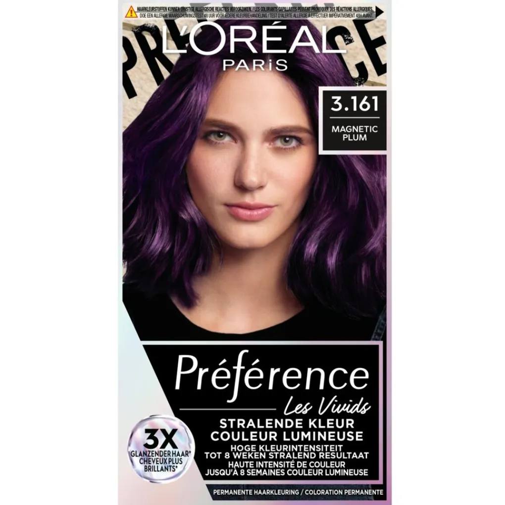 L’Oréal Paris Préférence Les Vivids 3.161 Magnetic Plum Permanente Haarkleuring is een permanente haarverf met krachtige en pure kleurpigmenten die bijdragen aan een intense, levendige kleur met een hoge kleurintensiteit.
