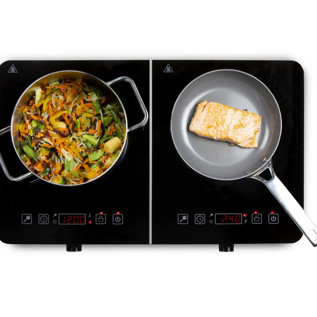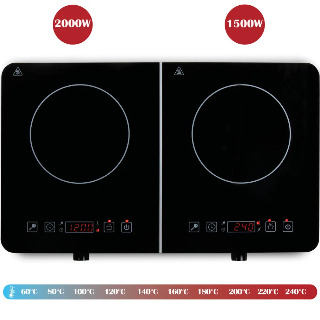 De PRIMO vrijstaande inductie kookplaat heeft 2 kookzones met een diameter van 18 cm geschikt voor potten en pannen met een diameter van 12-26 cm. Het totale vermogen van 3500W wordt verdeeld over beide kookoppervlakken (2000W | 1500W). Beide zones zijn met behulp van het touchpad en draaiknoppen apart regelbaar tot 10 verschillende temperatuurstanden van 60°C tot 240°C. Ook de timer en het kinderslot zijn per kookzone apart in te stellen.