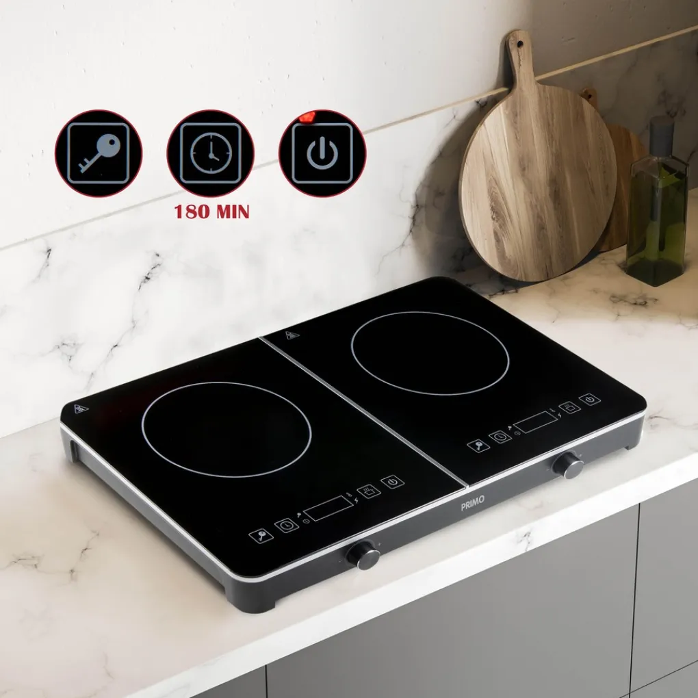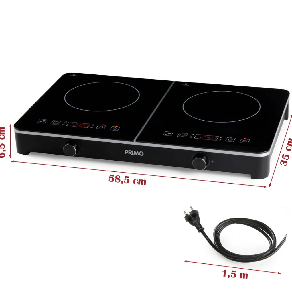 De PRIMO PR303IKP 2-pits vrijstaande inductiekookplaat is de perfecte aanvulling in je keuken. De inductie kookplaat heeft een vermogen van 3500W en 10 verschillende temperatuurstanden (60 – 240°C) per zone. De 2 kookzones hebben een diameter van 18 cm en zijn makkelijk te bedienen met behulp van de touch bediening en draaiknoppen. Dankzij de ingebouwde timer, kinderslot en oververhittingsbeveiliging kan je veilig koken met deze inductiekookplaat. De compacte afmetingen zorgen ervoor dat je de kookplaat makkelijk kan verplaatsen en opbergen.