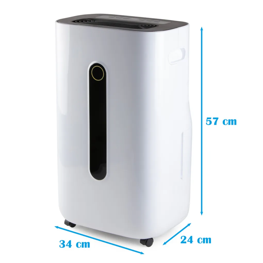 Met afmetingen van 34 x 24 x 57 cm past deze luchtontvochtiger perfect in elke ruimte, zonder in de weg te staan. De moderne uitstraling en het discrete ontwerp zorgen ervoor dat het apparaat naadloos in je interieur opgaat. De luchtontvochtiger beschikt over twee snelheden, zodat je zelf kan bepalen hoe snel de lucht in de ruimte wordt ontvochtigd. Dit geeft je volledige controle over je comfort.