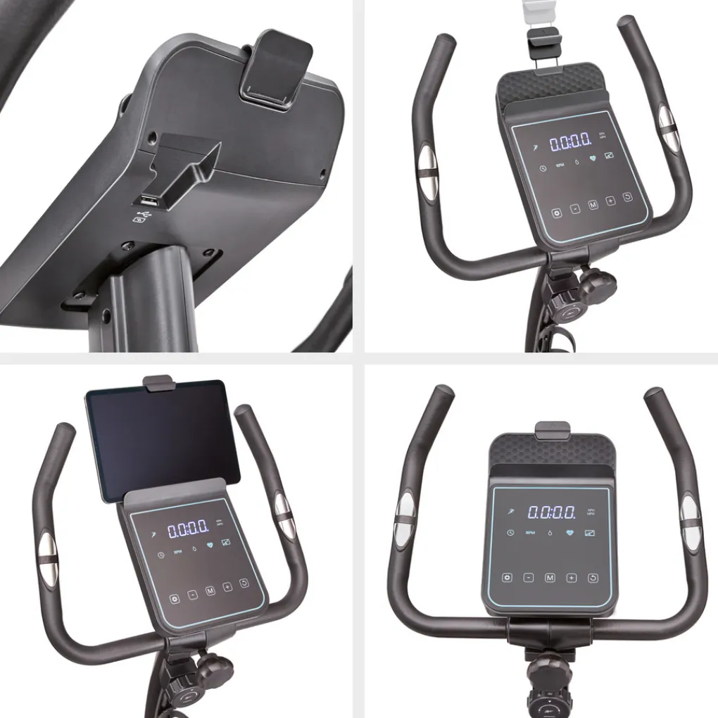 - Geïntegreerde handpolssensoren op de handgrepen meten en rapporteren de hartslag