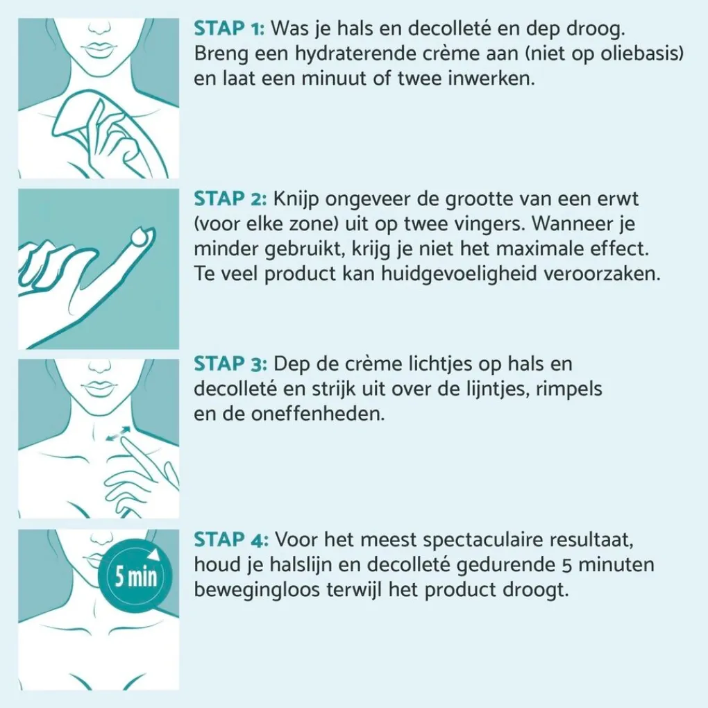 Gebruiksaanwijzing: Stap 1: Was uw gezicht en dep droog. Breng een hydraterende crème aan (niet op oliebasis) en laat een minuut of twee inwerken. Stap 2: Knijp ongeveer de grootte van een erwt (voor elke zone) uit op twee vingers; minder is niet voldoende en meer is meestal te veel en wordt dan niet volledig door de huid opgenomen of kan irritatie veroorzaken. Stap 3: Dep de crème lichtjes op nek en decolleté en strijk uit over de lijntjes. rimpels en de oneffenheden. Stap 4: Voor het meest spectaculaire resultaat, houd uw halslijn en decolleté gedurende 5 minuten bewegingloos terwijl het product droogt. Om te verwijderen: Reinig de zone met water en dep droog. In combinatie met make-up: Breng de make-up zoals gewoonlijk aan, maar vermijd make-up op oliebasis omdat dit de effectiviteit van Remescar Hals & Decolleté vermindert. Na het aanbrengen van uw make-up kunt u een zeer dun laagje Remescar Hals & Decolleté aanbrengen op de te behandelen zone zoals hierboven aangegeven. Als je een wit laagje ziet, hebt u teveel product gebruikt of geen hydraterende dagcrème gebruikt. Veeg het witte residu weg met een beetje water.