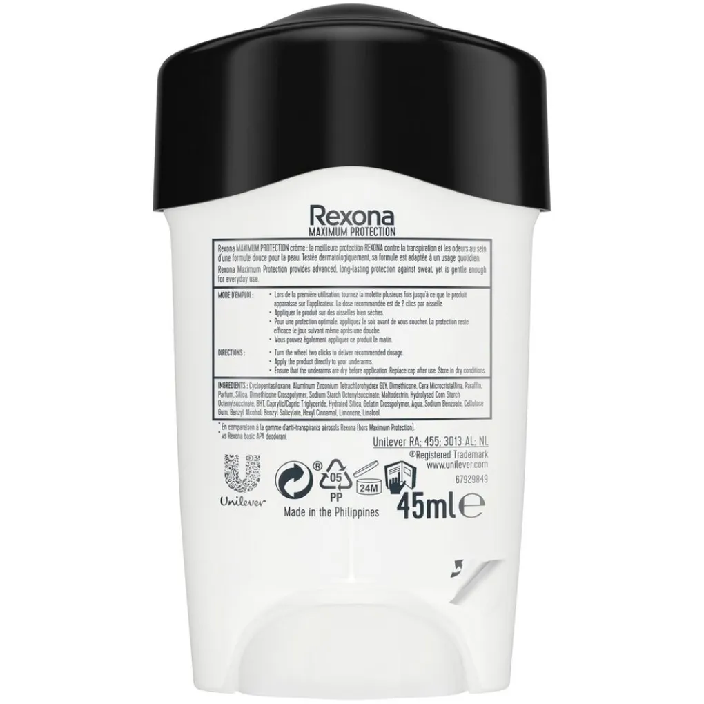 Ingredients: Cyclopentasiloxane, Aluminum Zirconium Tetrachlorohydrex GLY, Dimethicone, Cera Microcristallina, Paraffin, Parfum, Silica, Dimethicone Crosspolymer, Sodium Starch Octenylsuccinate, Maltodextrin, Hydrolysed Corn Starch Octenylsuccinate, BHT, Caprylic/Capric Triglyceride, Hydrated Silica, Gelatin Crosspolymer, Aqua, Sodium Benzoate, Cellulose Gum, Benzyl Alcohol, Benzyl Salicylate, Hexyl Cinnamal, Limonene, Linalool.