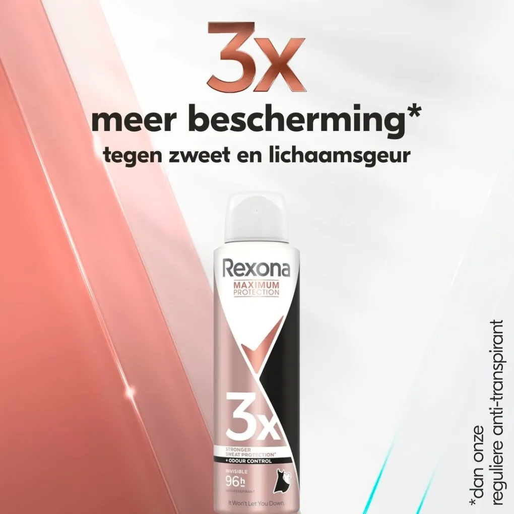 De Rexona Woman Maximum Protection Antitranspirant Spray biedt drie keer meer bescherming dan de reguliere Rexona antitranspirant. De spray geeft je 96 uur bescherming tegen zweet en lichaamsgeur.