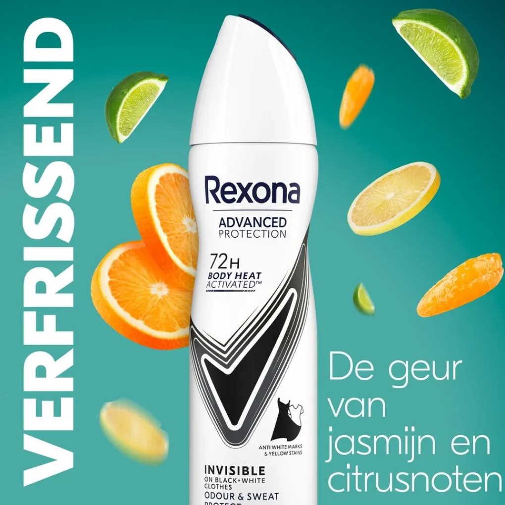 Rexona Women Advanced Protection Invisible Antitranspirant Spray met Body Heat Activated technologie beschermt tot 72 uur tegen zweet, lichaamsgeur en vlekken.