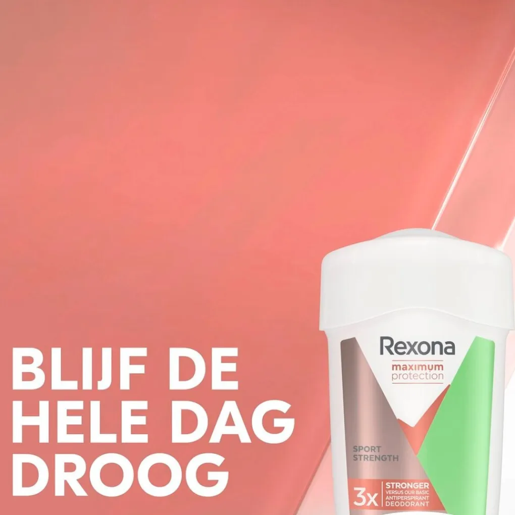 Rexona Women Maximum Protection Sport Strength Deodorant Cream Stick beschermt drie keer beter tegen transpiratie dan gewone deodorant dankzij de klinisch bewezen TRIsolid-formule. Naast actieve antitranspirantwerkstoffen bevat deze formule ook milde huidverzorgende en hydraterende bestanddelen voor je kwetsbare okselhuid.