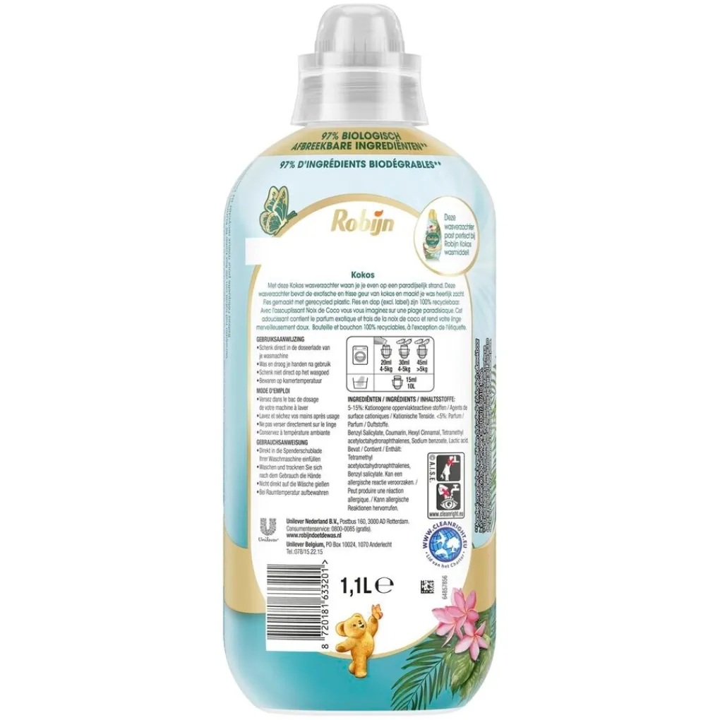 De Robijn Collections Kokos Wasverzachter, met een heerlijk tropische geur, beschermt je kleding tegen slijtage en maakt het heerlijk zacht. De wasverzachter is voor 95% biologisch afbreekbaar.