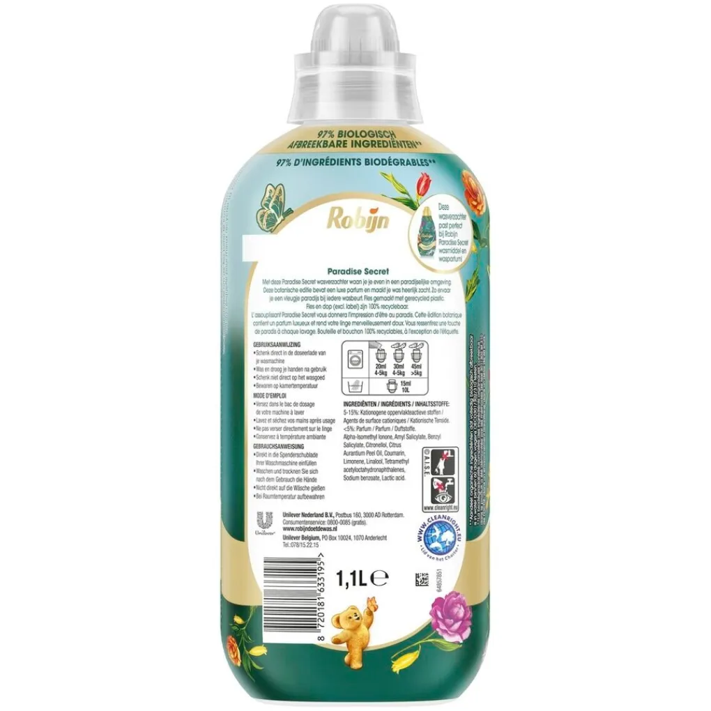 De Robijn Collections Paradise Secret Wasverzachter, met een heerlijk tropische geur, beschermt je kleding tegen slijtage en maakt het heerlijk zacht. De wasverzachter is voor 95% biologisch afbreekbaar.