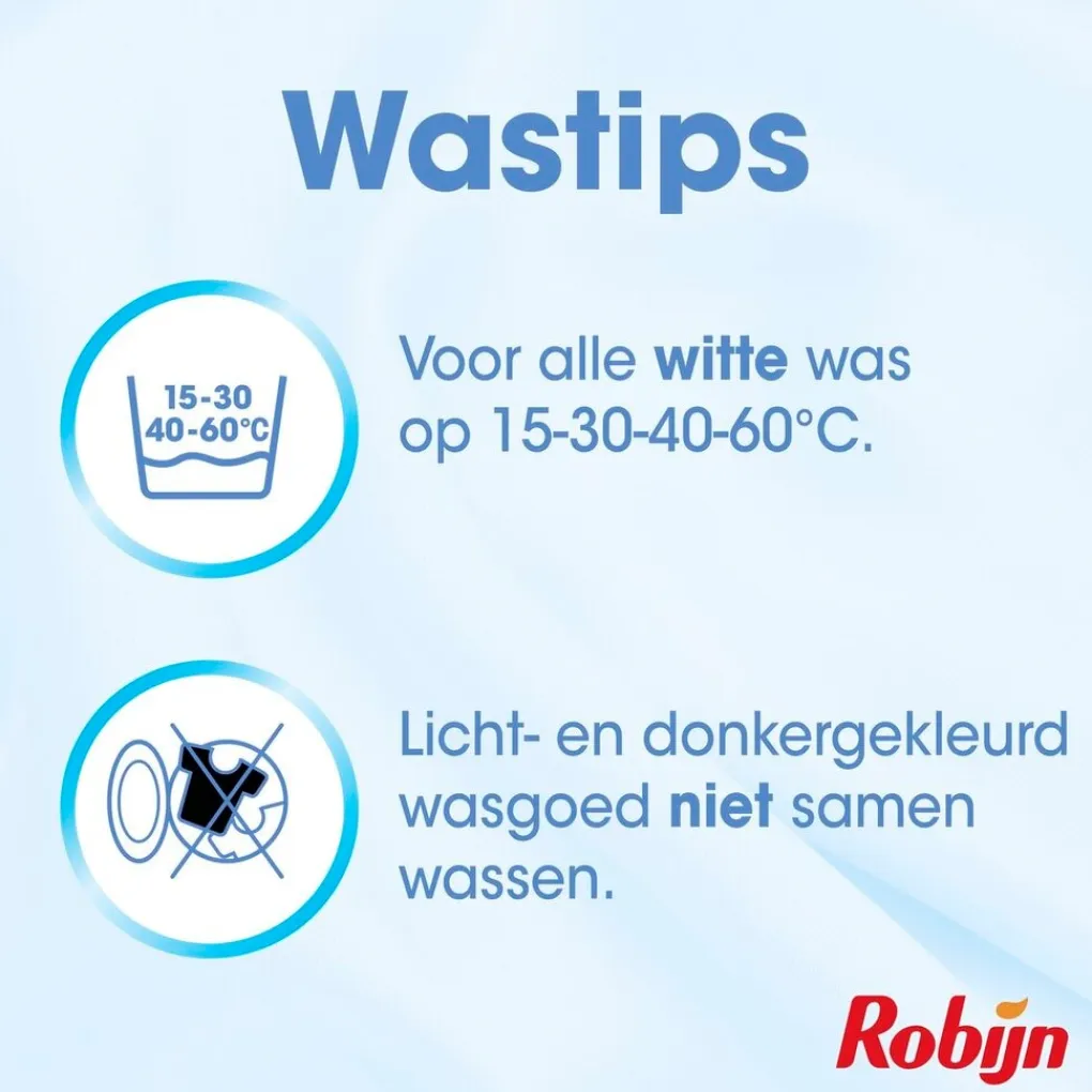 De lichtgewicht Robijn White Wasmiddeldoekjes zorgen voor een frisse en schone was. Ze zijn handig in gebruik en flexibel te doseren doordat je ze kan scheuren. Daarnaast lossen ze direct op na contact met water in je wasmachine.