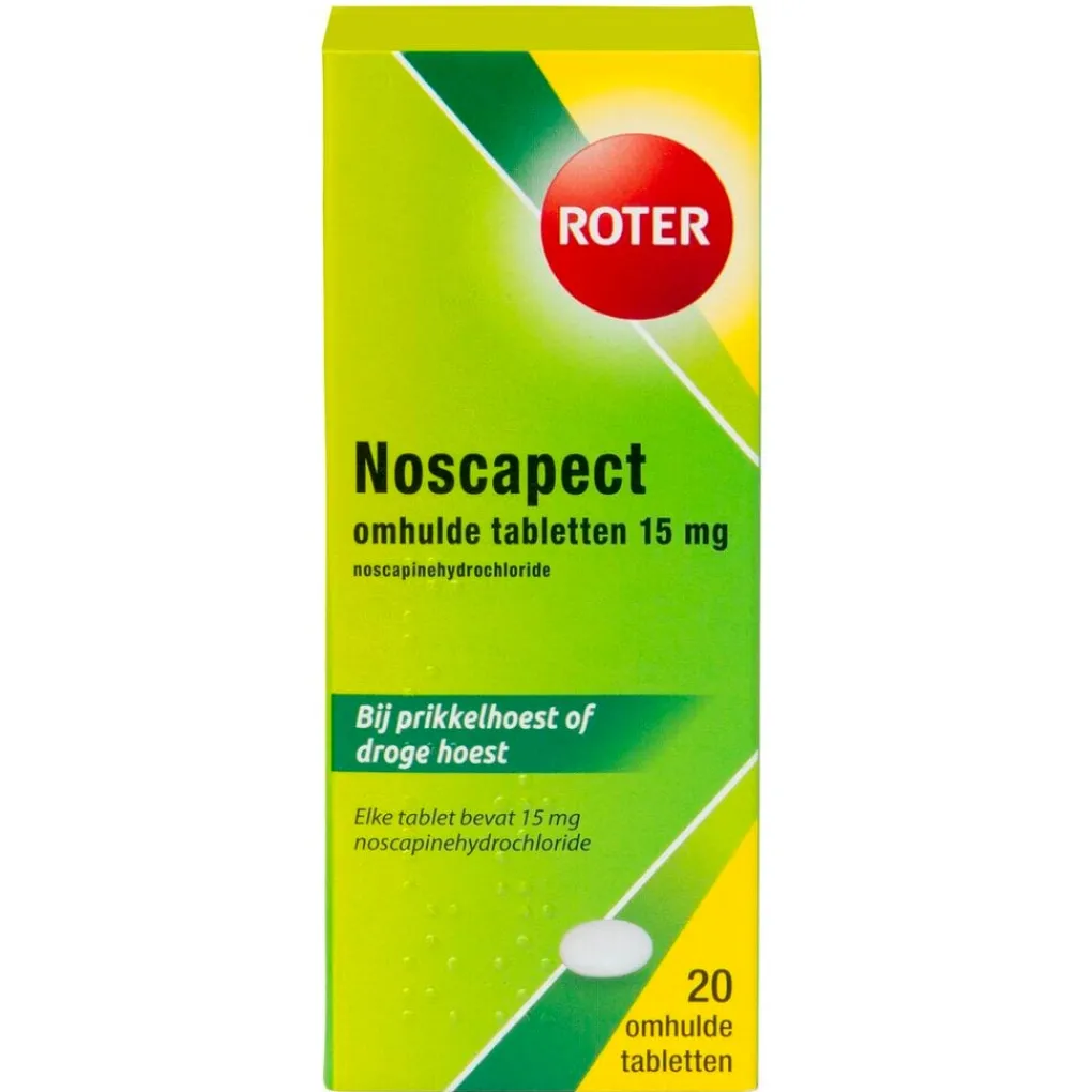 Gebruik: Aanbevolen dosering: • Kinderen jonger dan 6 jaar: alleen op voorschrift van de arts • Kinderen van 6 tot 15 jaar: 1 tablet, 3 tot 4 keer per dag •Jong volwassen vanaf 15 jaar en volwassen: 1 of 2 tabletten, 3 tot 4 keer per dag. Bevat de werkzame stofnoscapinehydrochloride 15 mg. Roter Nocapect tabletten is een geneesmiddel.