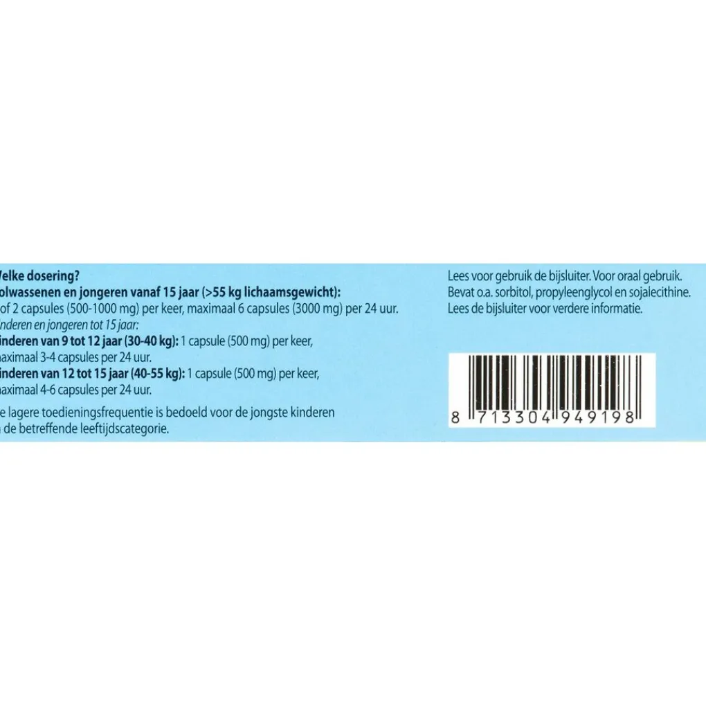 Samenstelling: Elke liquid cap bevat 500 mg paracetamol. Bevat verder o.a. sorbitol, propyleenglycol en sojalecithine.