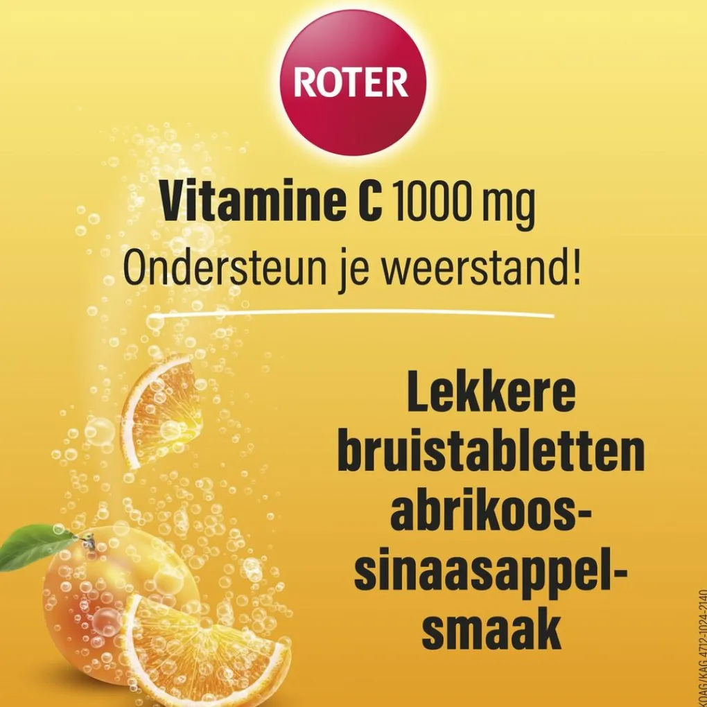 Roter Vitamine C 1000 mg Abrikoos-Sinaasappel Bruistabletten ondersteunen je natuurlijke weerstand met een hoge dosis vitamine C. De bruistabletten lossen makkelijk op in water en zijn dus handig bij moeite met slikken.