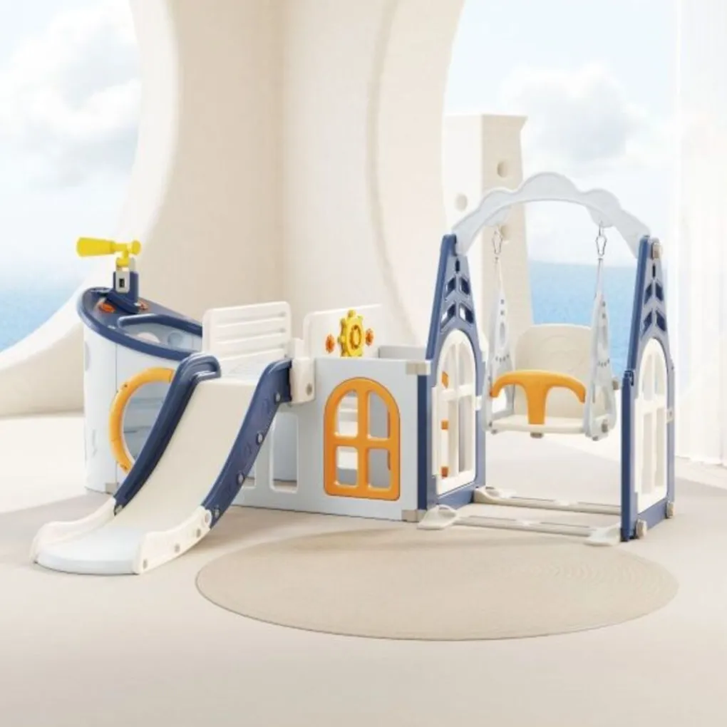 • Bevat een glijbaan, een schommel, een basketbalring (inclusief bal), een draaibare verrekijker en een roer