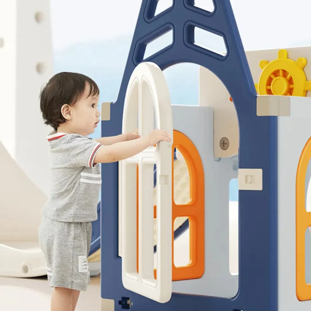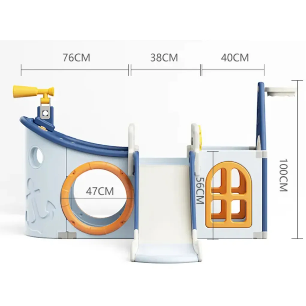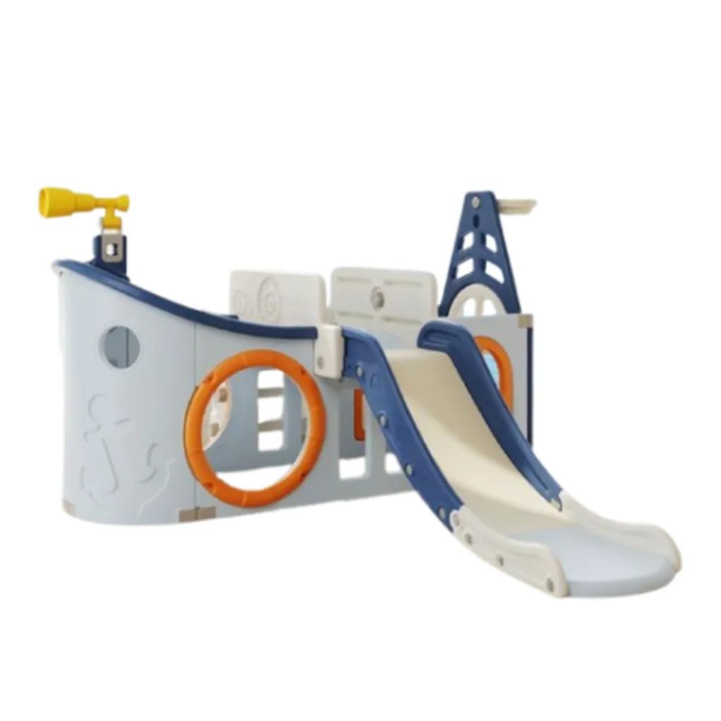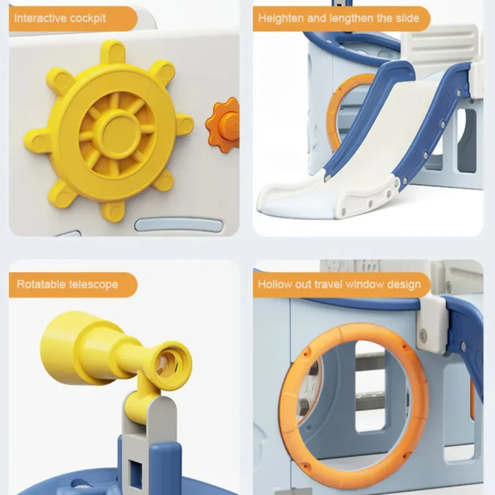 • Bevat een glijbaan, een basketbalring (inclusief bal), een draaibare verrekijker en een roer