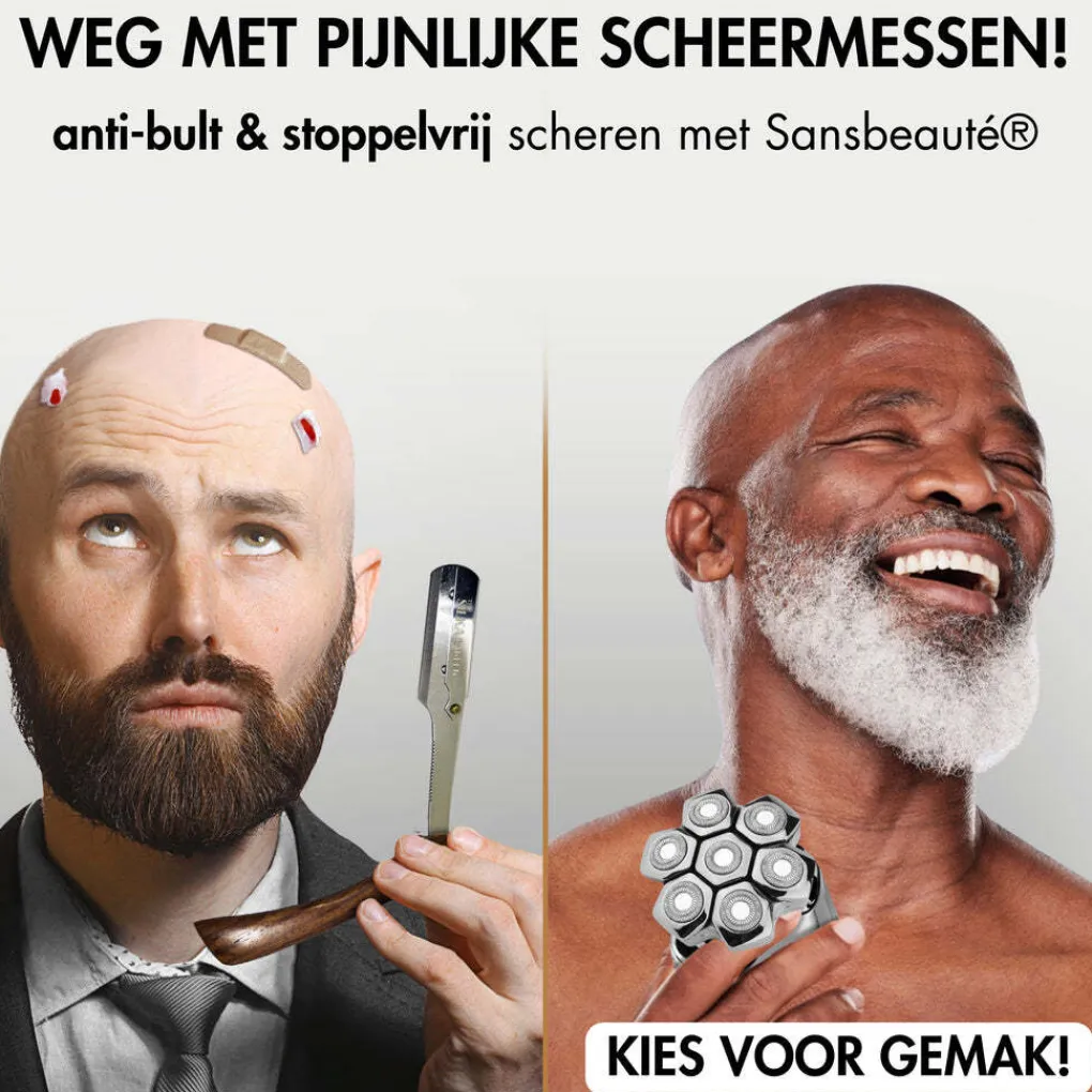 - Groter scheeroppervlak – Met 7 (!) ronde scheerkoppen bereikt het scheerapparaat van Sansbeauté® een groter scheeroppervlak zodat er meerdere haartjes tegelijk worden meegepakt. Zeven flexibele 7D scheerbladen bewegen vloeiend over je kin, schedel en wangen; het kan bijna niet makkelijker!