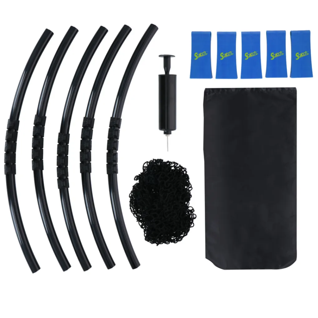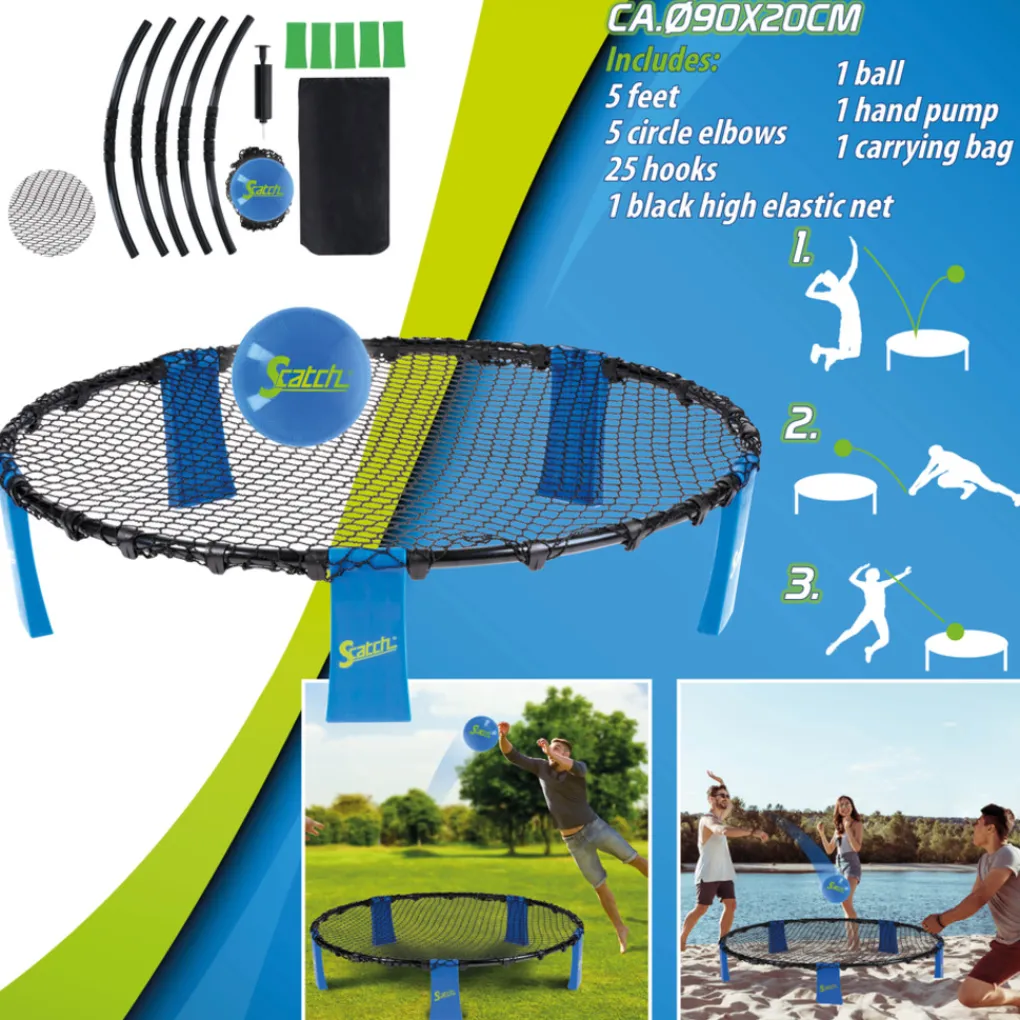 Het Scatch spyderball spel wordt als complete set geleverd. In de set vindt je het frame bestaande uit 5 stukken, 5 poten, het roundnet, een bal, een pomp om de bal mee op te pompen en een handige draagtas. Montage is snel en zeer gemakkelijk, maar moet wel onder toezicht van een volwassene gebeuren. Wanneer je de slam ball set niet gebruikt kun je hem het beste afbreken en veilig opbergen in de bijgeleverde reistas zodat hij zo lang mogelijk mee gaat. In deze reistas kun je de spyderball set ook gemakkelijk meenemen naar een middag in het park, een dagje aan het strand en zelfs op vakantie. Dankzij de afmetingen van 92 x 20 centimeter kun je spyderball ook binnen spelen, mits daar voldoende ruimte voor is.