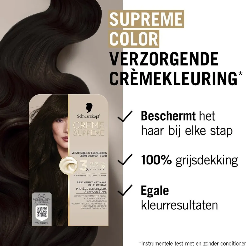 Met de Schwarzkopf Creme Supreme 3-0 Natuurlijk Extra Donkerbruin Verzorgende Crèmekleuring krijg je de kleur die je wilt met de verzorging die je verdient. De permanente crèmekleuring heeft het drie keer bonding Haptiq System.