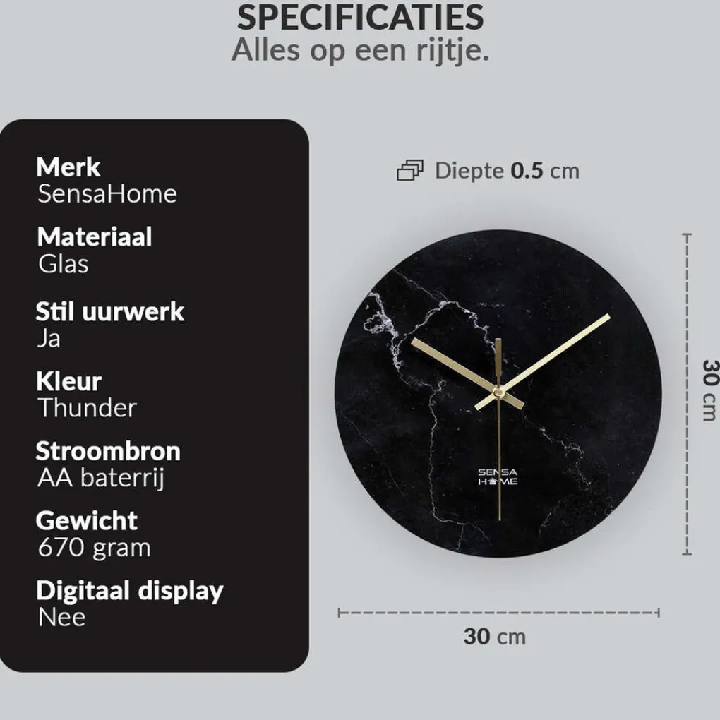 Zoek je al een tijdje naar een wandklok wat ook dient als mooie muurdecoratie? Dan is deze wandklok van SensaHome hetgeen wat je zoek. Deze wandklok van SensaHome is uniek door zijn glazen marmeren design. Een prachtig en modern ontwerp met een geluidloos uurwerk zorgt voor een rustgevend en efficiënte muurdecoratie. De wandklok van SensaHome is batterij aangedreven waardoor je geen rekening hoeft te houden waar je de klok ophangt