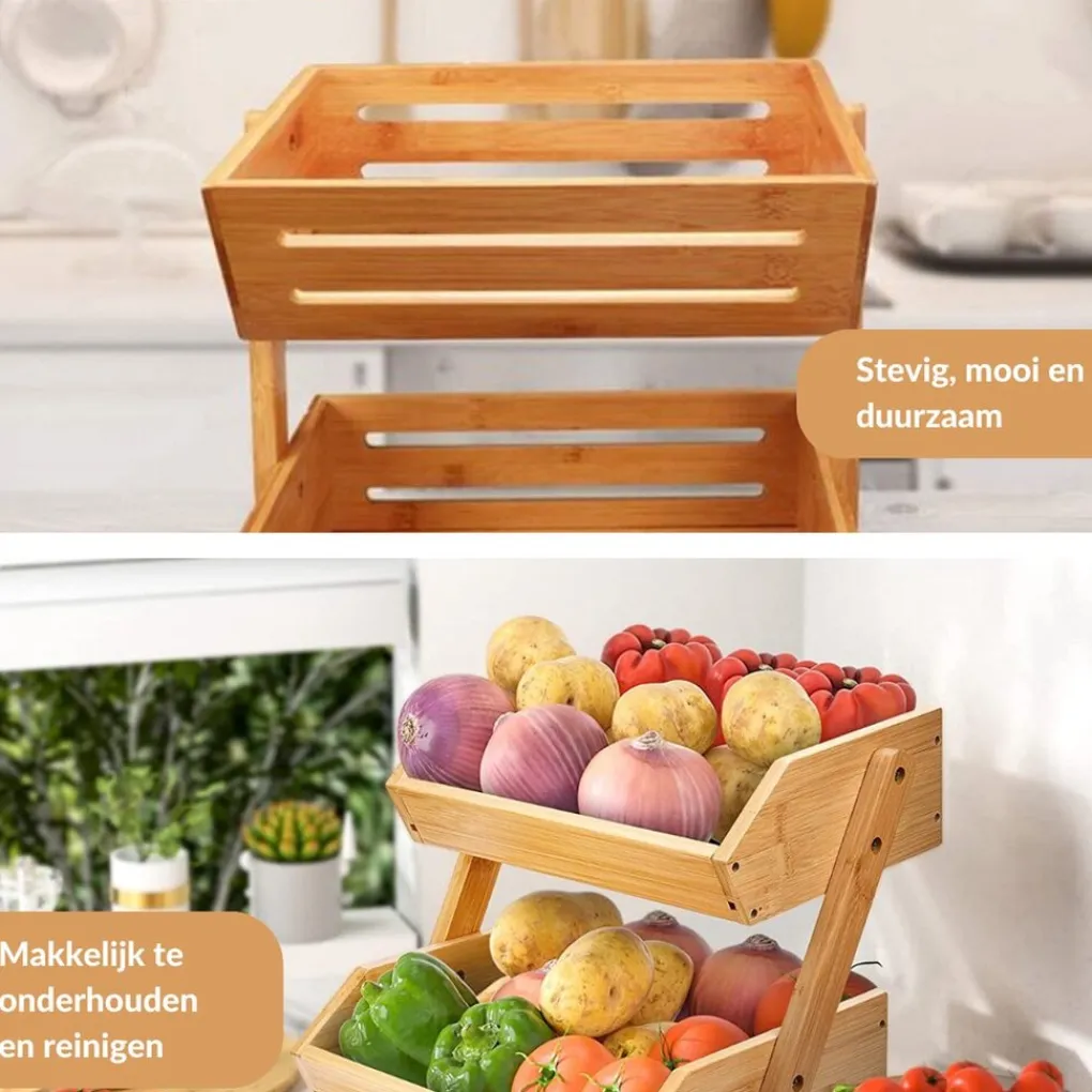 Ontdek de SensaHome Luxe Bamboehouten Fruitkist, een stijlvolle en functionele 2-laagse etagère die perfect is voor het opbergen en presenteren van fruit, snacks of andere lekkernijen. Het landelijk en klassieke ontwerp past goed bij elke keuken of eetkamer.