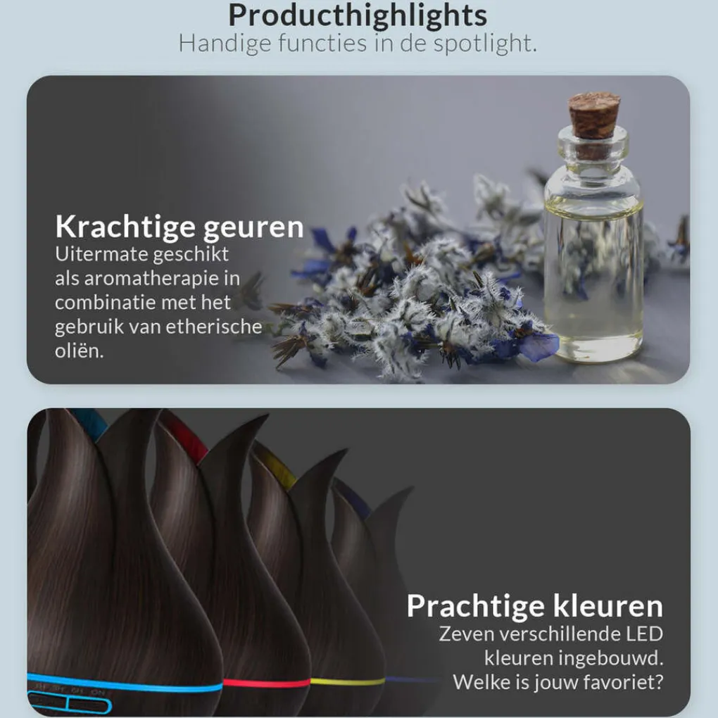 5 druppels per 100 ml water voor een milde geur. Voor kinderen zijn 1-2 druppels voldoende. De diffuser heeft 3 functies: aroma verspreiden, lucht bevochtigen en als nachtlamp dienen dankzij de ledverlichting. Plaats de diffuser op een geschikte plek, voeg geurolie toe en geniet van een frisse geur in je woning.