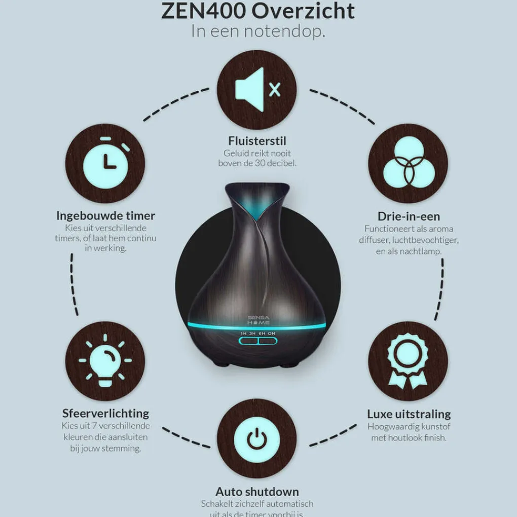 De Zen400 is de grootste aroma diffuser met een 400 ml waterreservoir, wat zorgt voor een langere damptijd. Je kunt zeker 10 uur genieten van een ontspannende en frisse geur door je hele woning. Het luxe design en de variabele kleur zorgen voor een aangename sfeer, en het is een investering voor je interieur.