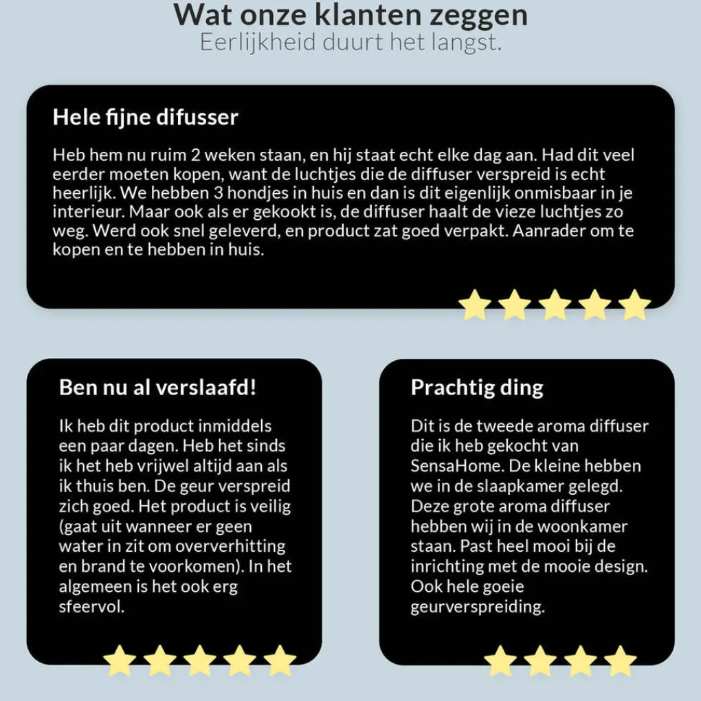 Zowel etherische- als parfumoliën kunnen gebruikt worden met de Aroma diffusers van SensaHome. Reinig het apparaat wekelijks voor een langere levensduur.