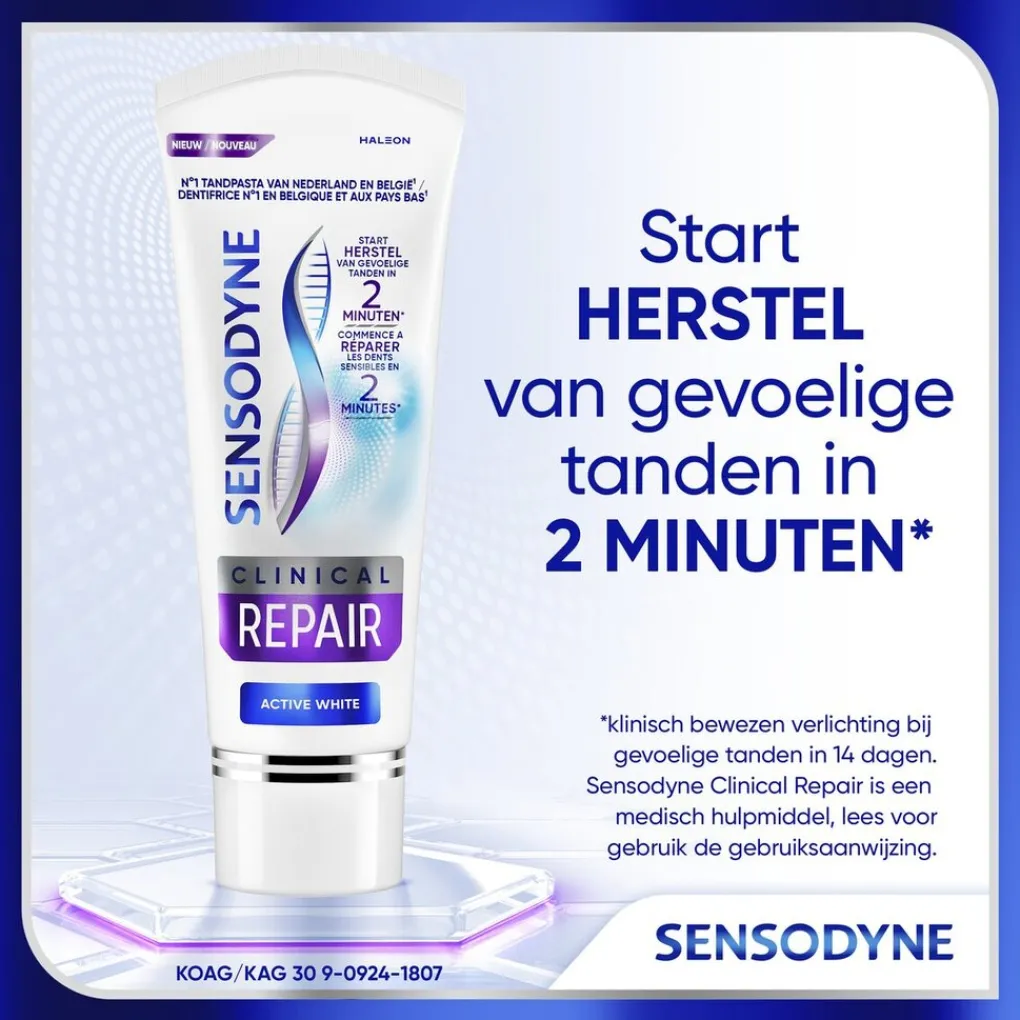 Start het herstel van gevoelige tanden in 2 minuten* met Sensodyne Clinical Repair Active White Tandpasta met 5% novamin.