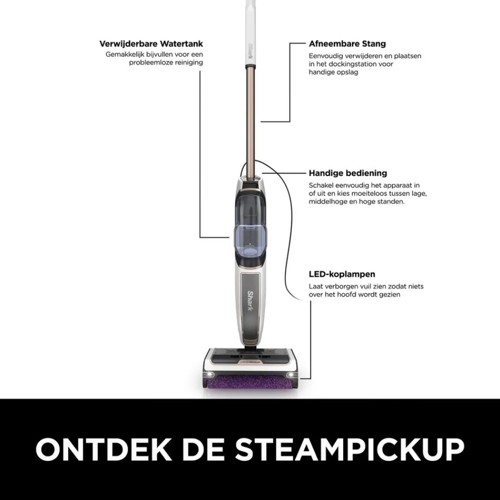 Ontdek de Shark SteamPickUp: de slimme 3-in-1 stoommop die vuil eenvoudig verwijdert, zacht schrobt en tegelijkertijd ontsmet. Of het nu gaat om gemorste ontbijtsporen, kruimels op de vloer of modderige pootafdrukken van huisdieren, de Shark SteamPickUp zorgt voor een snelle en moeiteloze schoonmaak. Ideaal voor huishoudens met kinderen en huisdieren, biedt de Shark Powered Pickup-technologie krachtige en veilige reiniging in één handomdraai.