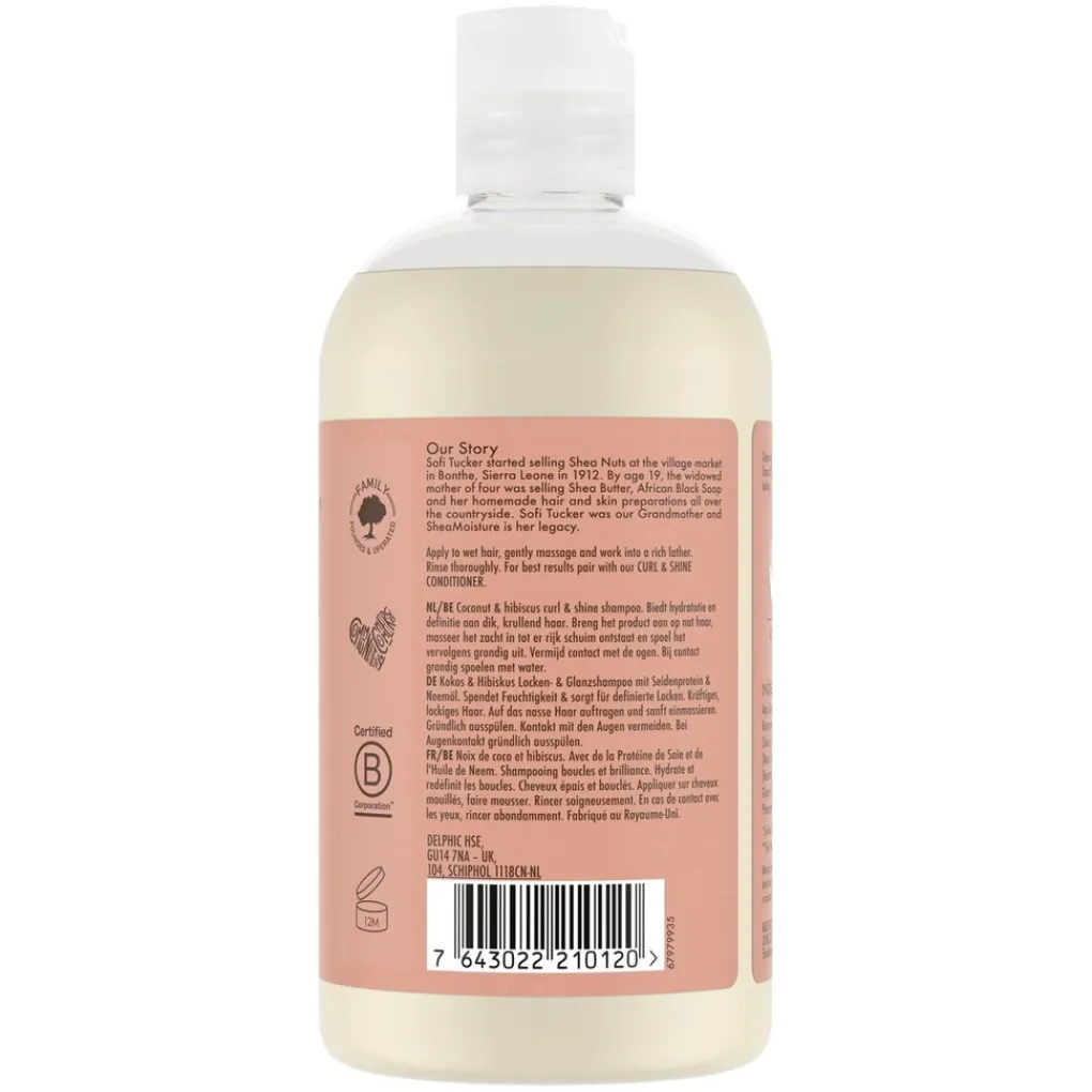 SheaMoisture Coconut & Hibiscus Curl & Shine Shampoo zorgt voor veerkrachtige en gezonde krullen. De shampoo zit boordevol alles wat je nodig hebt om je golvende, krullende haar te temmen en is geformuleerd met kokosolie, hibiscus, neemolie en zijdeproteïne. De vochtinbrengende formule hydrateert en beschermt je haar en vult verloren olie aan. De milde shampoo wast voorzichtig onzuiverheden weg en geeft je natuurlijk geurige, pluisvrije, gezonde golven en krullend haar.