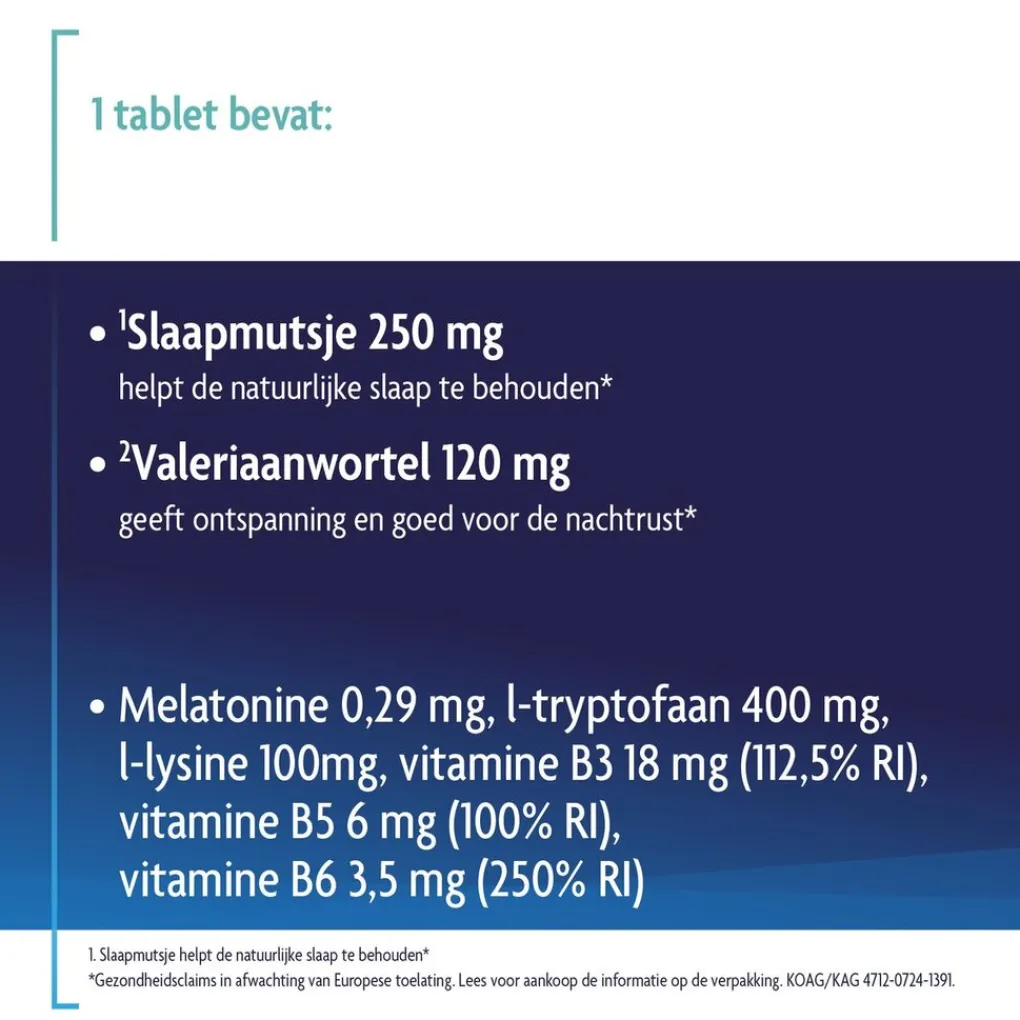 Ltryptofaan, slaapmutsje extract (Eschscholzia californica), vulstof(cellulose), l-lysine HCl, Valeriaanextract (Valeriana officinalis), vulstof (calciumfosfaten), stabilisator (vernette natrium carboxymethylcellulose), kleurstof (calciumcarbonaat), antiklontermiddel (magnesiumzouten van vetzuren), vulstof (silicium dioxide), antiklontermiddel (vetzuren),nicotinamide, glansmiddelen