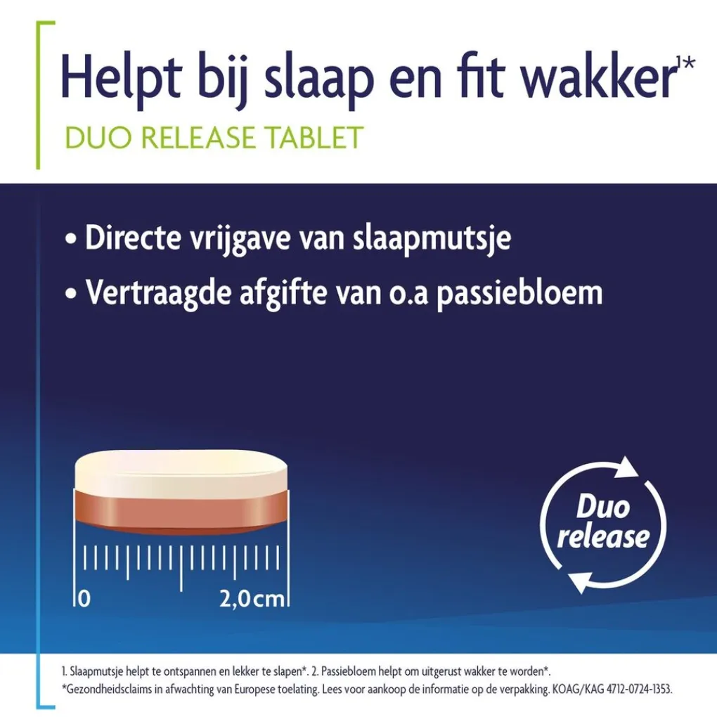 Fase 1: De 1ste laag met melatonine en slaapmutsje komt direct na inname vrij. Slaapmutsje draagt bij behoud van aan een gezonde slaap*.