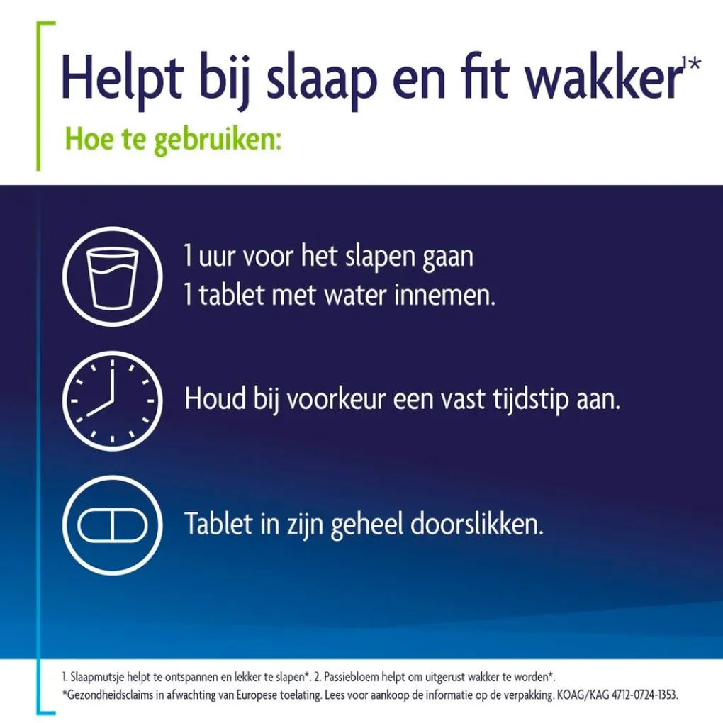 Dosering: 1 uur voor het slapen gaan 1 tablet met water innemen. Houd bij voorkeur een vast tijdstip aan. Aanbevolen dagelijkse dosis niet overschrijden. Tablet in zijn geheel doorslikken.