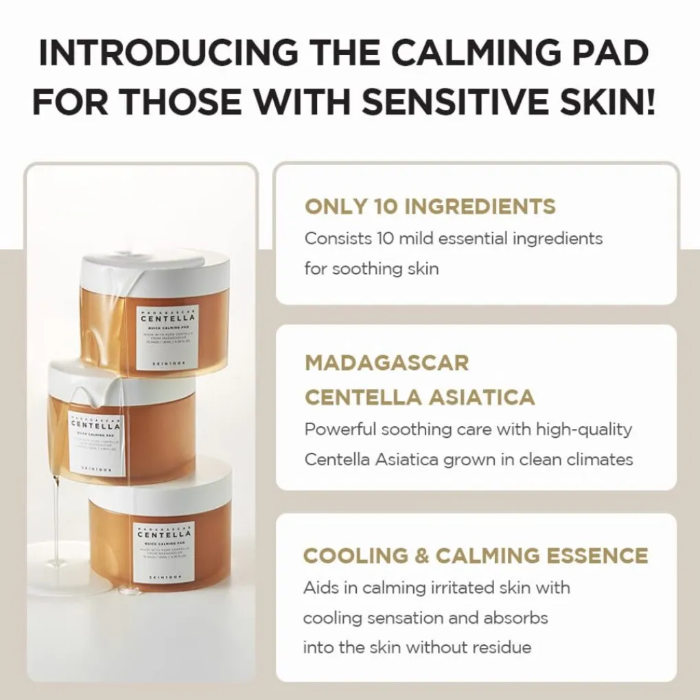 De SKIN1004 Madagascar Centella Quick Calming Pad is een kalmerend tonerpads ontworpen om de gevoelige of geïrriteerde huid snel te verzachten en intens te hydrateren. Elke drievoudige pad is doordrenkt met 49% Centella Asiatica-extract uit Madagaskar, bekend om zijn ontstekingsremmende en huidherstellende eigenschappen. Daarnaast bevatten de pads Panthenol en Natriumhyaluronaat om het vochtgehalte van de huid te verhogen en de elasticiteit te verbeteren. Dankzij de halve maanvorm zijn ze gemakkelijk aan te brengen rond de ogen en neus, als handig alternatief voor sheetmaskers. Deze vegan en dierproefvrije pads zijn vrij van alcohol, parabenen en kunstmatige geurstoffen, en daardoor geschikt voor alle huidtypes – vooral voor de gevoelige huid.