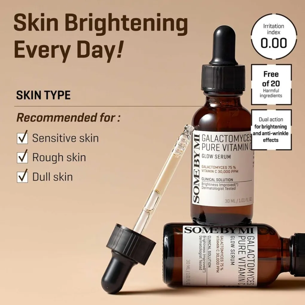 Het SOME BY MI Galactomyces Pure Vitamin C Glow Serum is een krachtig verhelderend serum dat 75% Galactomyces Ferment Filtrate combineert met 3% pure vitamine C (30.000 ppm) om de huid te hydrateren, te egaliseren en een natuurlijke glow te geven. De formule is verrijkt met niacinamide, adenosine en panthenol, die samen helpen bij het verminderen van pigmentvlekken, het verbeteren van de huidtextuur en het stimuleren van collageenproductie voor een stevigere en soepelere huid. Antioxidanten zoals propolis, zwarte chokeberry en rooibos beschermen de huid tegen schadelijke invloeden van buitenaf, terwijl ingrediënten als hyaluronzuur en trehalose zorgen voor diepe hydratatie. Vrij van kunstmatige geurstoffen, kleurstoffen, parabenen, sulfaten en siliconen, is dit serum geschikt voor alle huidtypes en ideaal voor wie op zoek is naar een stralende, egale teint.