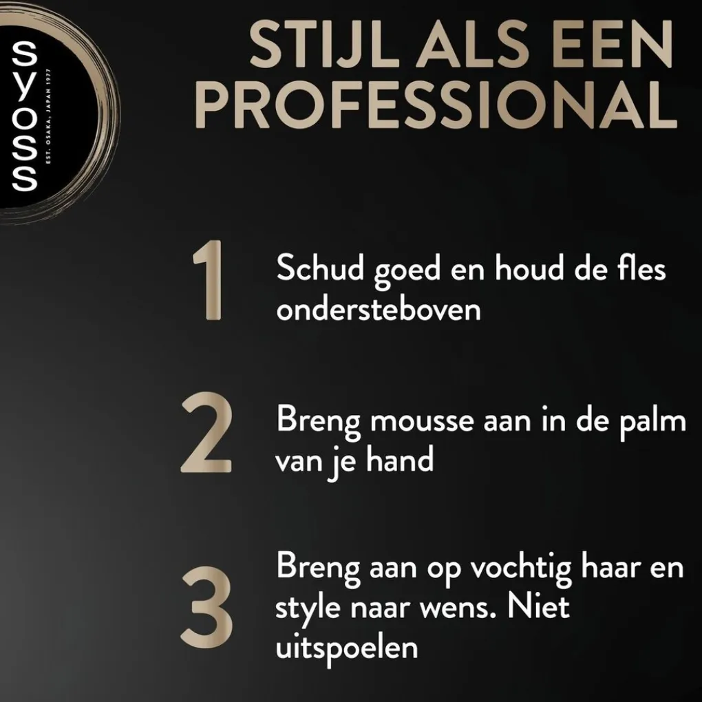 Voor gebruik de bus goed schudden en ondersteboven houden. Het schuim in de hand spuiten en aanbrengen op vochtig haar. Het haar in het gewenste model brengen. Niet uitspoelen. Voor een optimaal resultaat, fixeer met Syoss Hairspray.