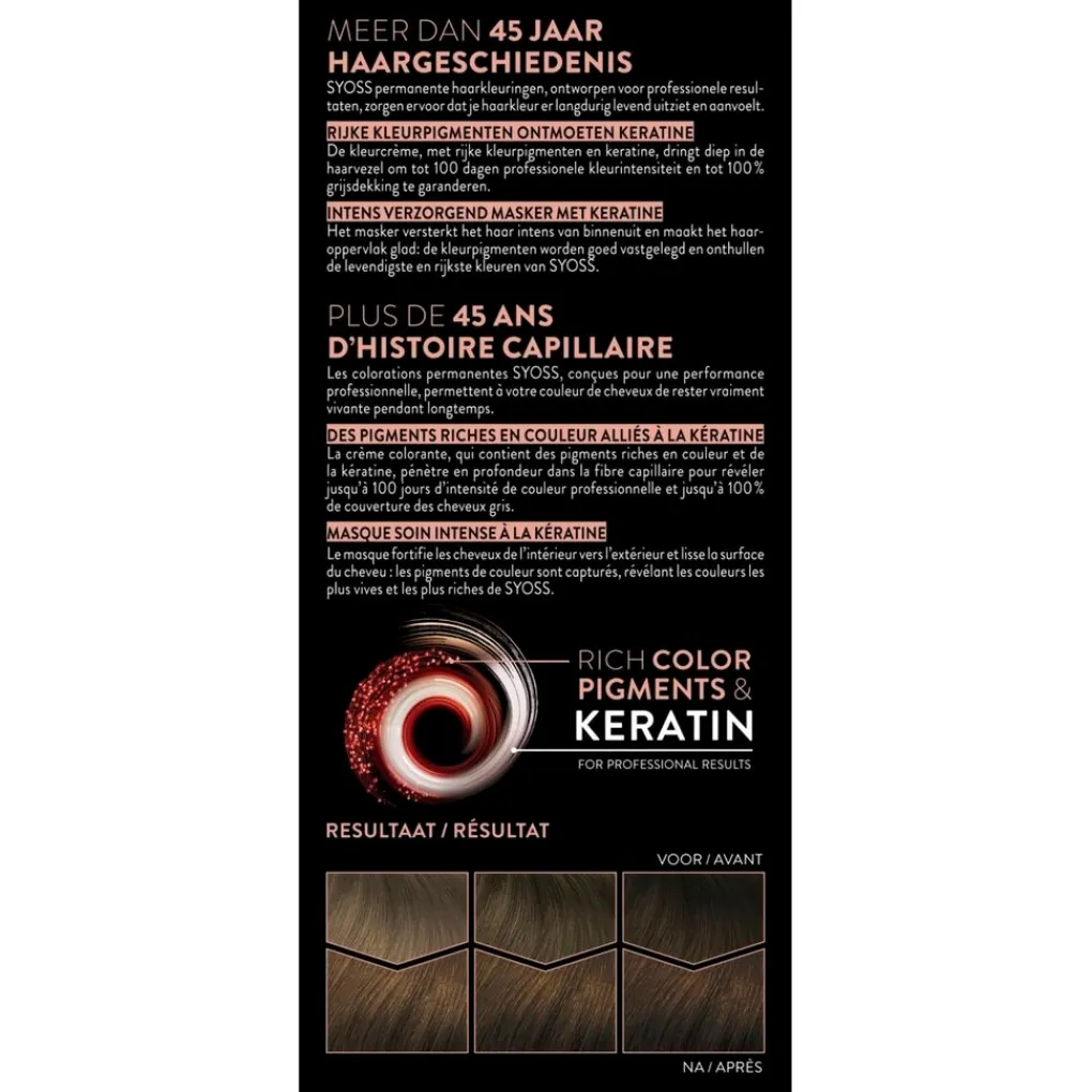 Hoe gebruikt u de Syoss haarkleuring? Bereid het mengsel voor zoals aangegeven is in de gebruiksaanwijzing en breng het aan op droog ongewassen haar. Laat het mengsel inwerken en spoel het daarna grondig uit. De inwerktijd is afhankelijk van de gekozen nuance, raadpleeg de gebruiksaanwijzing. Was je haar met een milde shampoo, breng het haarmasker aan en laat 2 minuten inwerken. Grondig uitspoelen. BELANGRIJK: Lees nauwkeurig voor gebruik de veiligheidsaanbevelingen van de gebruiksaanwijzing door. Voer altijd een allergie waarschuwingstest uit.
