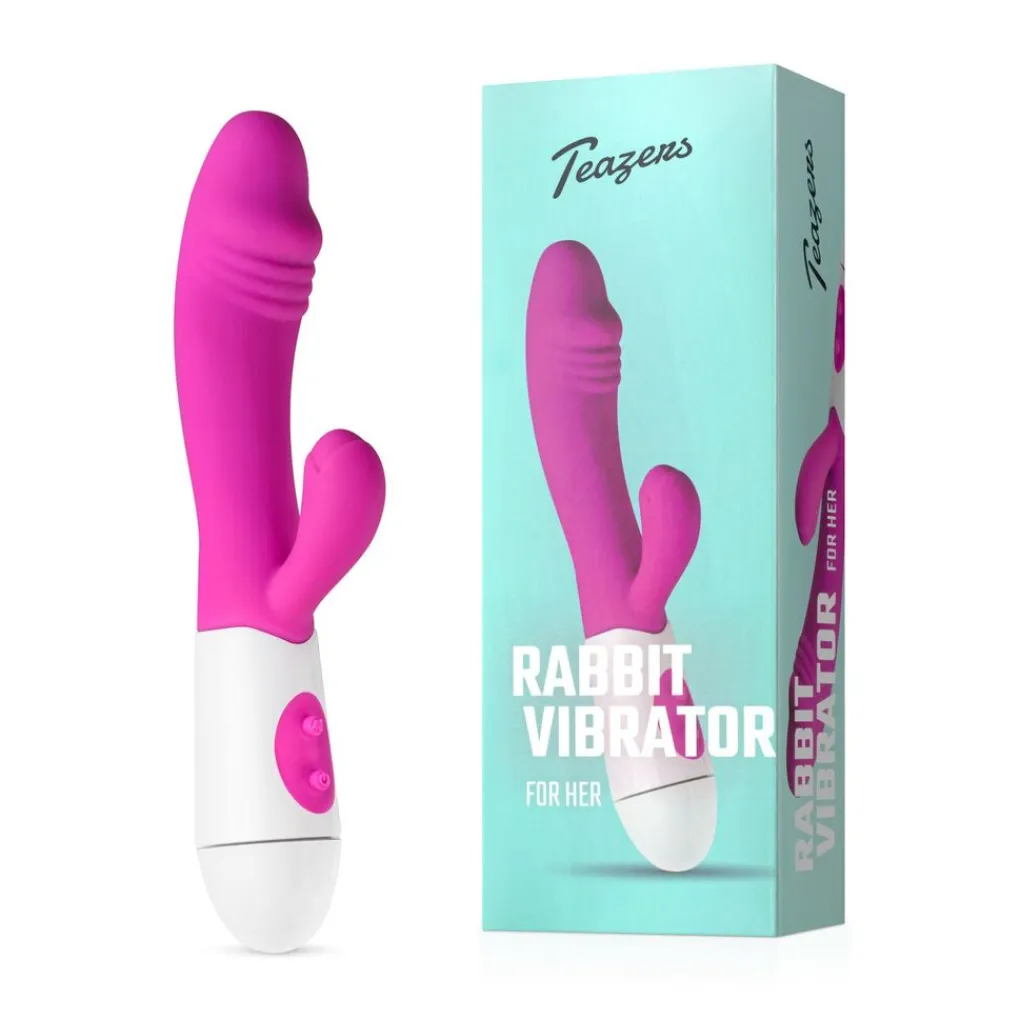 Verwen jezelf of je partner met deze leuke rabbit vibrator uit de Teazers collectie. Dit speeltje zorgt voor een heerlijke stimulatie van je vagina, clitoris en G-spot. Hij is voorzien van 10 verschillende vibratiestanden, waarvan 3 snelheden en 7 patronen. Deze zijn eenvoudig in te stellen met de knopjes op het handvat. Druk kort op de aan-/uitknop om de vibrator aan te zetten. Hij begint meteen te vibreren in de eerste stand. Druk daarna steeds kort op het patronenknopje om naar de volgende stand te gaan. Na de laatste stand begint hij automatisch weer bij de eerste stand. Druk op het aan-/uitknopje om de vibrator weer uit te zetten. Maak de toy voor en na gebruik grondig, maar voorzichtig schoon met toycleaner of een milde zeep en handwarm water voor een goede hygiëne. Berg de vibrator op in een toybag of leg hem op een donkere, droge en stofvrije plek.