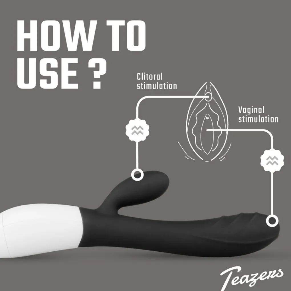 Een zwarte tarzan vibrator met een modern design. De siliconen vibrator stimuleert tegelijkertijd de G-spot en clitoris waardoor jij alleen nog maar je favoriete stand hoeft te kiezen. Wat wordt jouw favoriet uit de 30 verschillende standen? De zwarte vibrator heeft een gebogen top voor G-spot stimulatie met een licht geribbelde structuur voor meer intensiteit. De flexibele clitorisstimulator buigt mee met het lichaam voor optimaal comfort. Gebruik de Teazers Tarzan Vibrator met glijmiddel op waterbasis voor een aangename penetratie. Batterijen heb je niet nodig, de oplaadbare vibrator wordt geleverd met een USB-oplaadkabel.