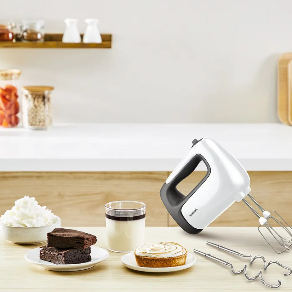 Er gaat niets boven zelfgebakken producten! Met deze handmixer worden al je voorbereidingen een succes – je familie en vrienden zullen versteld staan van je versgebakken creaties. Hier is de ideale metgezel voor perfecte bakresultaten: de Tefal Prep’Mix+ handmixer. Deze veelzijdige handmixer biedt eindeloze mogelijkheden met een 500W motor met hoog vermogen, ideaal voor zowel lichte als zware bereidingen. De twee roestvrijstalen kloppers maken licht mixen en opkloppen moeiteloos, terwijl de twee deeghaken perfect zijn voor taai deeg. Een krachtige mixer zorgt voor fijn gepureerde gerechten. Ontdek hoe gemakkelijk mixen is dankzij de vijf snelheden en turbostand van de Prep’Mix+ handmixer! Hier komen prestaties samen met slim design: de ergonomische handgreep met een gestructureerd oppervlak en een stabiele rustpositie is ideaal om je werkruimte schoon en netjes te houden. De afneembare, vaatwasmachinebestendige onderdelen van deze handmixer zijn ook erg praktisch.